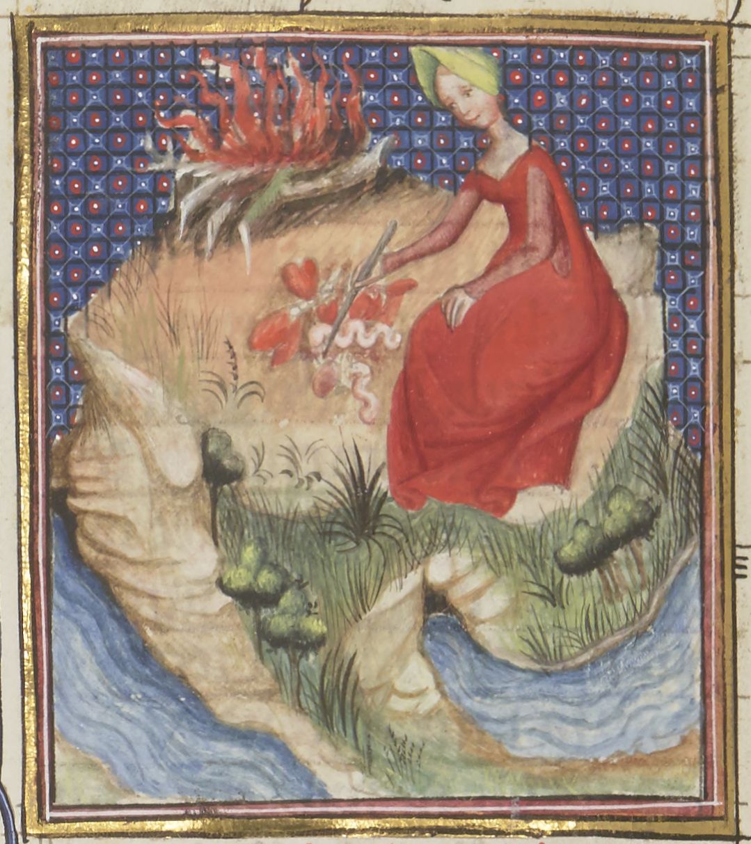 Parigi, Bibliothèque Nationale de France, Fr. 12420, f. 42v. L'indovina Manto, seduta accanto al fuoco, legge il futuro nelle viscere degli animali.