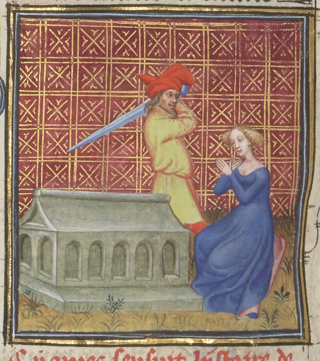 Parigi, Bibliothèque Nationale de France, Fr. 12420, f. 46v. Polissena viene sacrificata da Neottolemo sulla tomba di Achille.