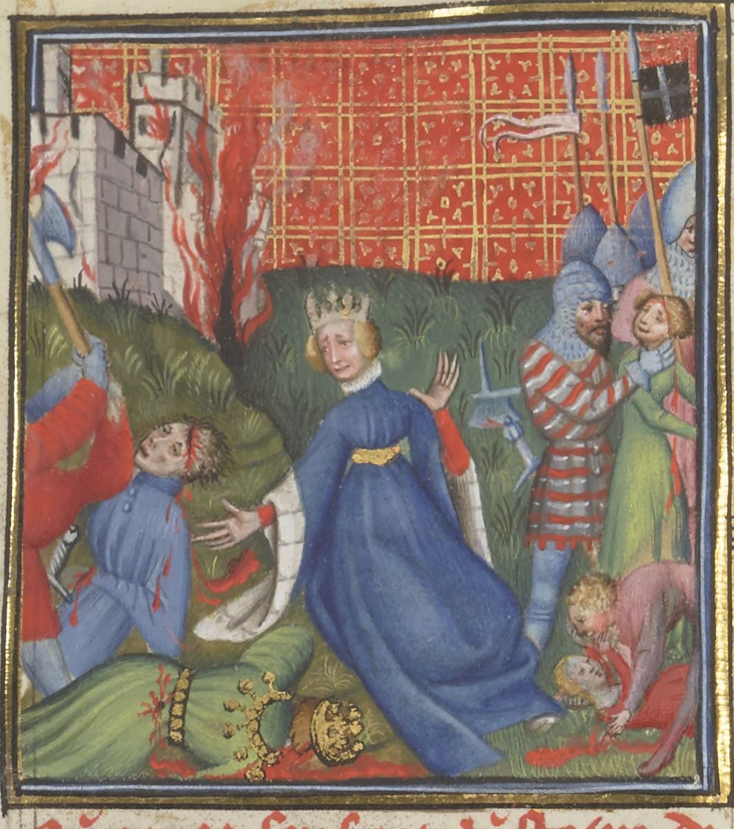 Parigi, Bibliothèque Nationale de France, Fr. 12420, f. 47v. Ecuba, moglie di Priamo, assiste alla morte del marito e dei figli per mano dei soldati greci; sullo sfondo, la città di Troia in fiamme.