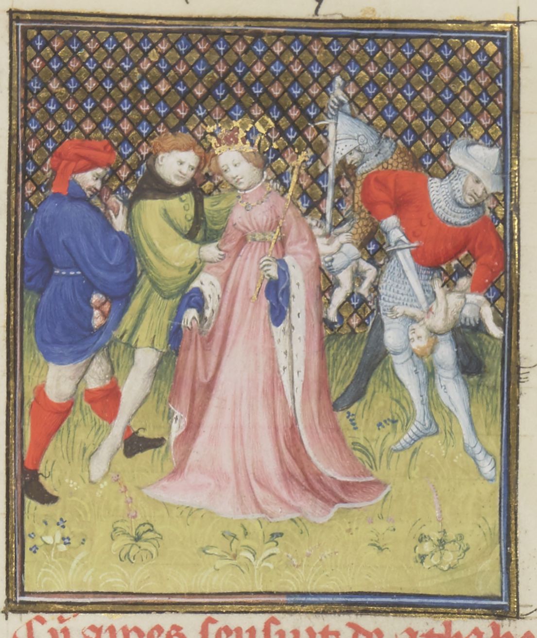 Parigi, Bibliothèque Nationale de France, Fr. 12420, f. 78r. Atalia, regina di Gerusalemme, viene condannata a morte dopo aver ordinato il massacro di tutti i discendenti maschi della stirpe di David.