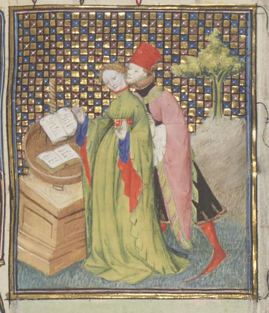 Parigi, Bibliothèque Nationale de France, Fr. 12420, f. 93r. Leonzio, dinanzi ad un leggio, è corteggiata da un ammiratore.