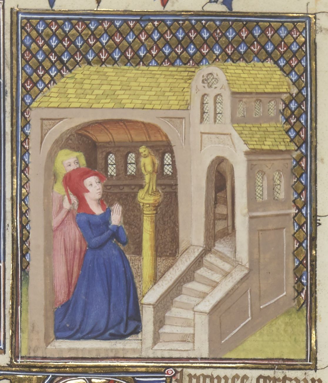 Parigi, Bibliothèque Nationale de France, Fr. 12420, f. 97r. Virginia prega nel tempio della Pudicizia dinanzi alla nuova statua della dea.