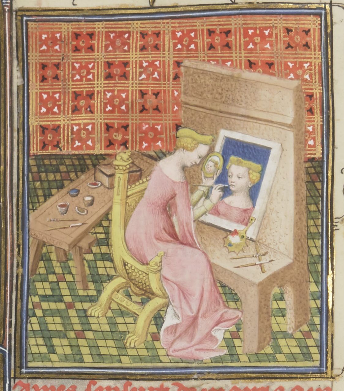 Parigi, Bibliothèque Nationale de France, Fr. 12420, f. 101v. Marzia dipinge il proprio autoritratto dinanzi allo specchio.