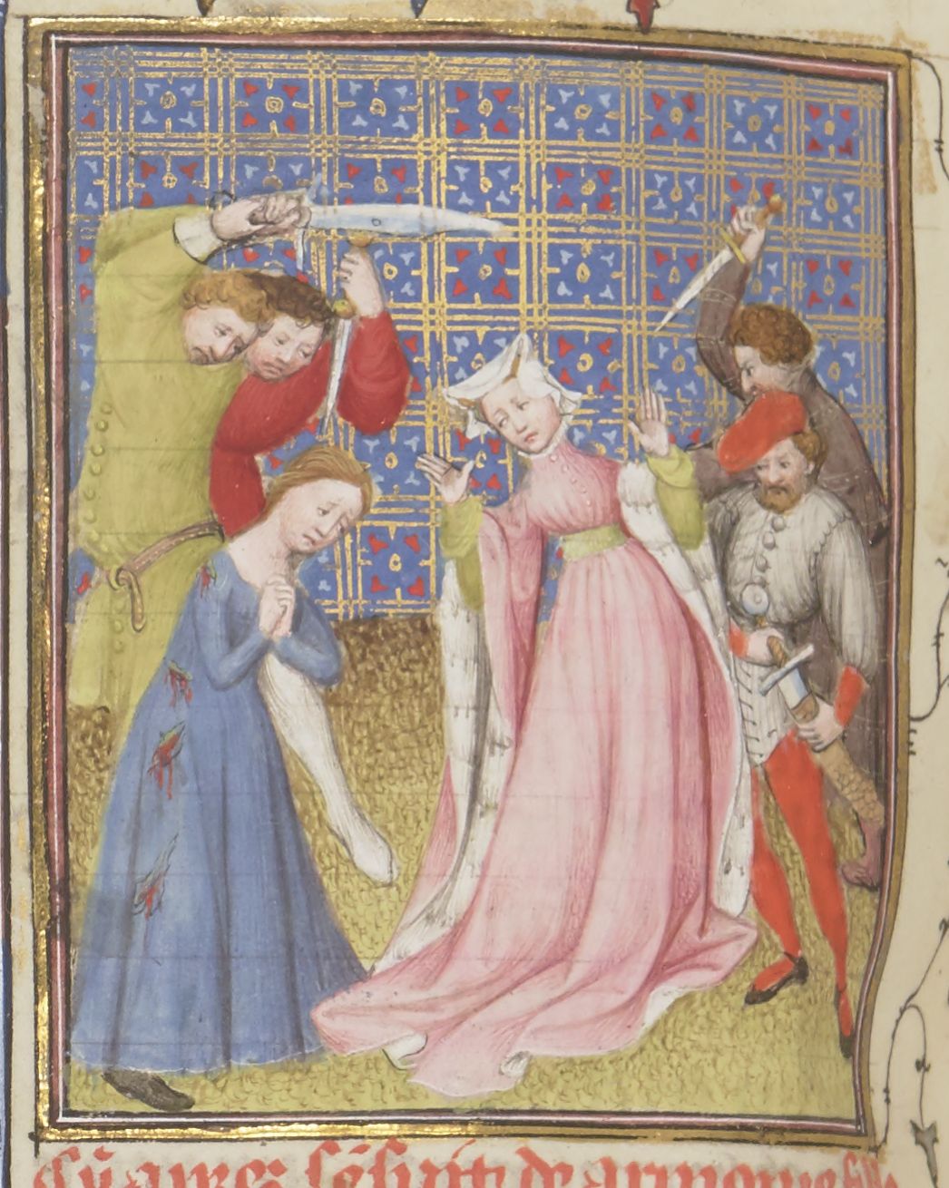 Parigi, Bibliothèque Nationale de France, Fr. 12420, f. 103v. Armonia assiste all'uccisione della giovane schiava che ha preso il suo posto, quindi si consegna ai sicari mandati per ucciderla.