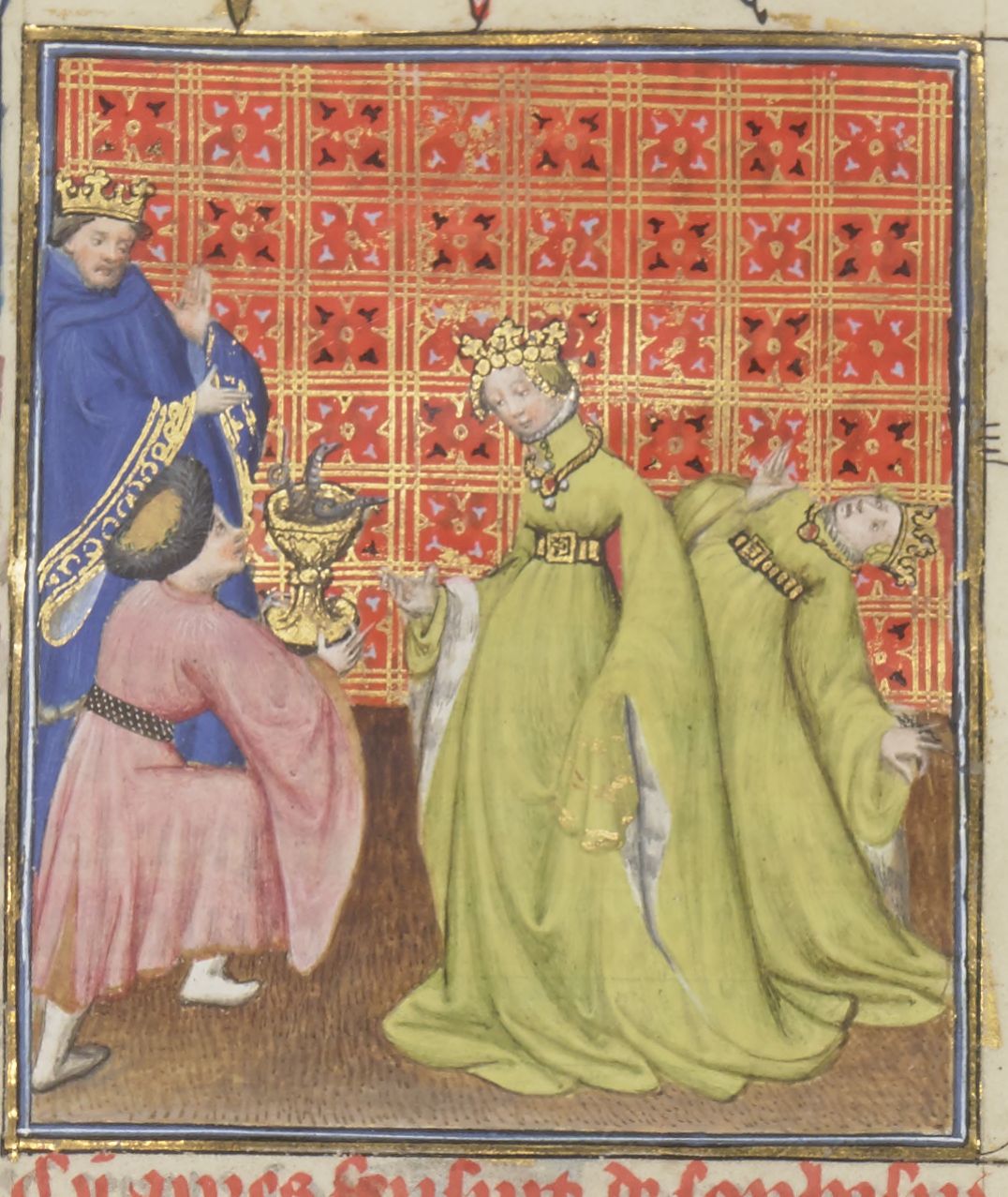 Parigi, Bibliothèque Nationale de France, Fr. 12420, f. 106r. Sofonisba riceve la coppa avvelenata inviata dal marito; la morte di Sofonisba.
