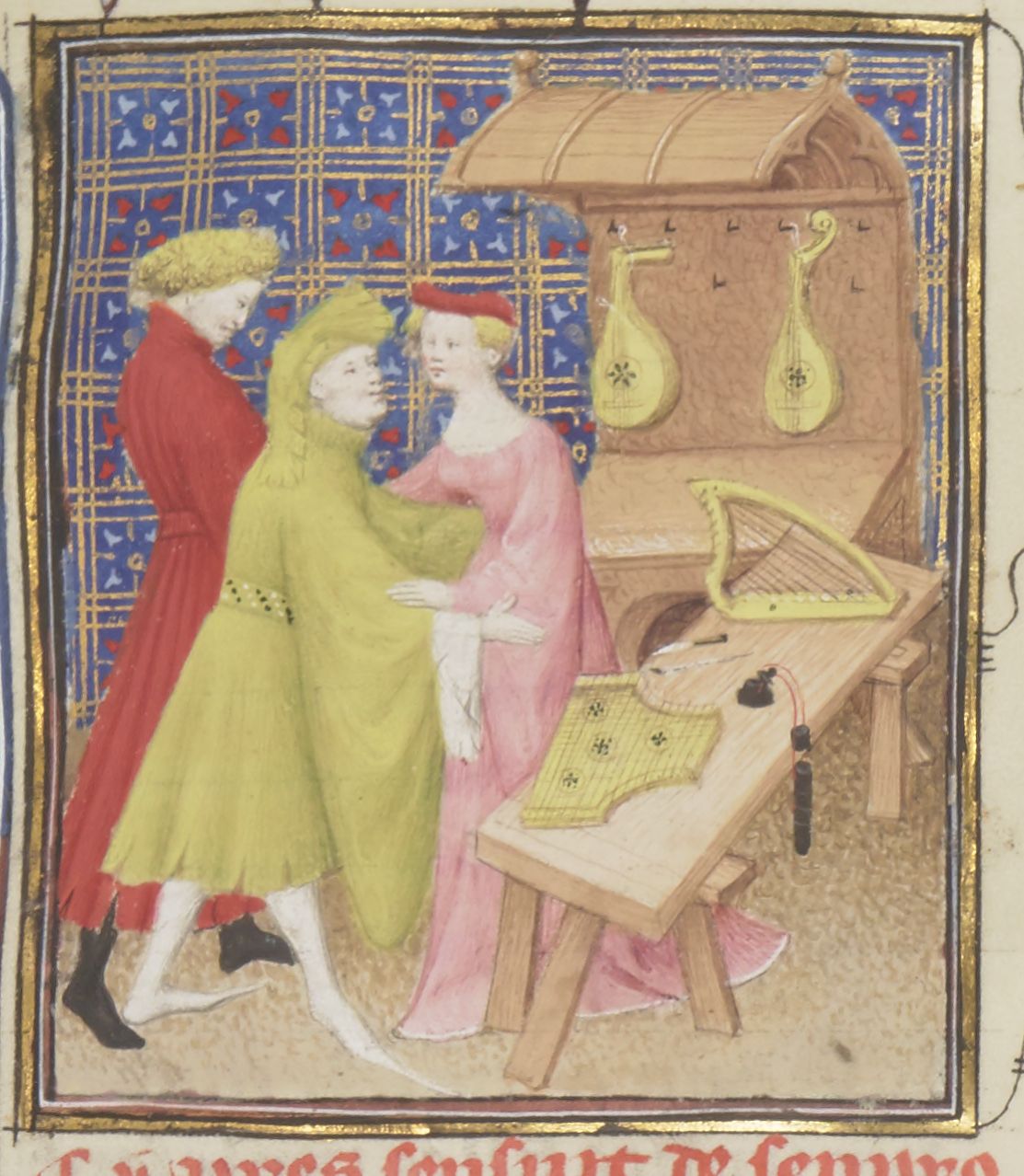 Parigi, Bibliothèque Nationale de France, Fr. 12420, f. 119r. Sempronia viene corteggiata da due uomini; sul tavolo vicino vi sono alcuni strumenti musicali.