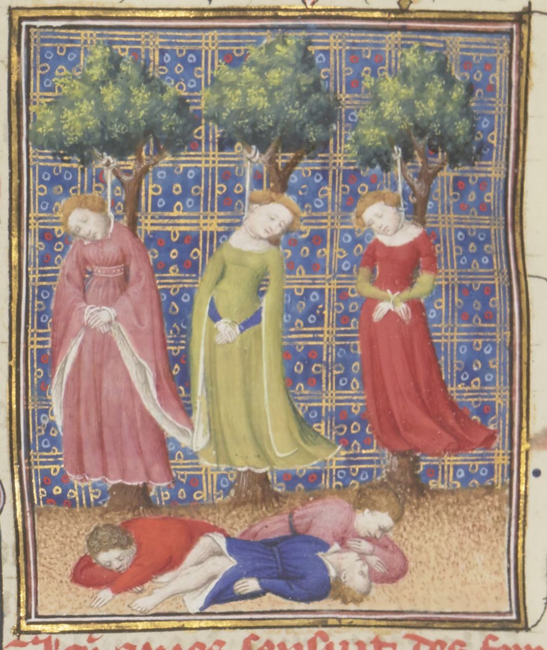 Parigi, Bibliothèque Nationale de France, Fr. 12420, f. 120v. Le mogli dei Cimbri vengono impiccate accanto ai corpi dei loro mariti.