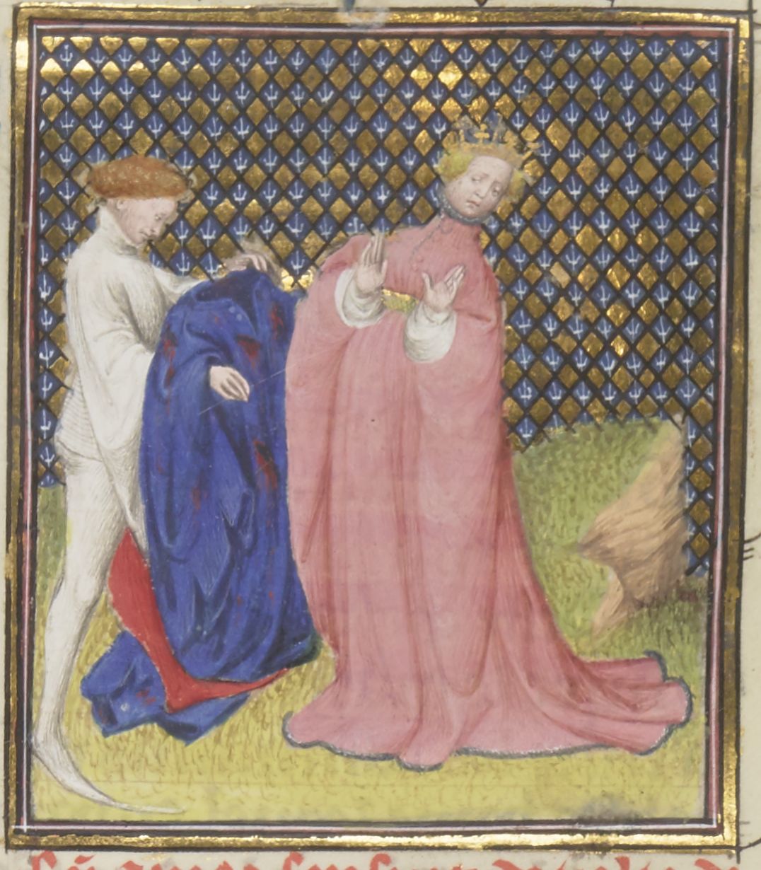 Parigi, Bibliothèque Nationale de France, Fr. 12420, f. 122r. Giulia, mogli di Pompeo, sviene alla vista delle vesti insanguinate del marito recate da un servo.