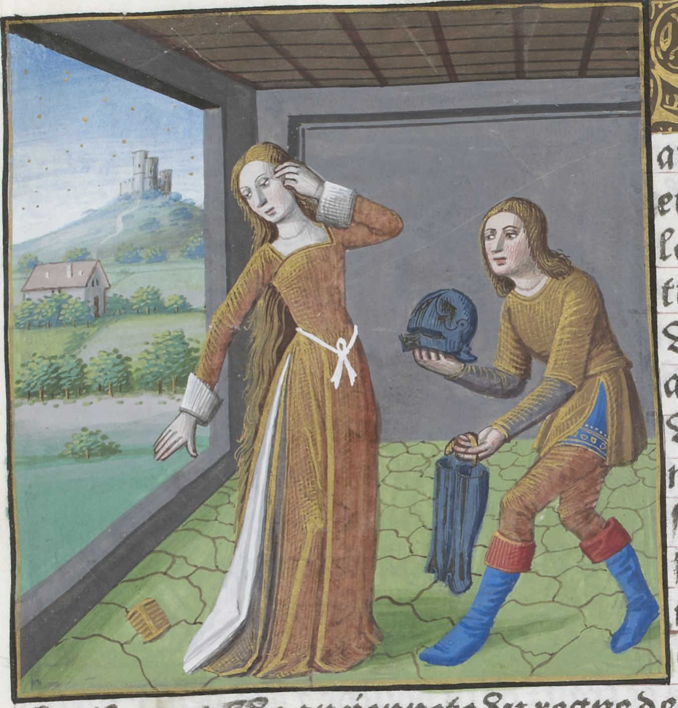 Parigi, Bibliothèque Nationale de France, Vélins 1223, f. a7r. Incunabolo miniato stampato a Parigi da Antoine Vérard il 26/04/1493. La regina Semiramide getta il pettine per indossare l'elmo e l'armatura che le vengono offerti da un servitore.