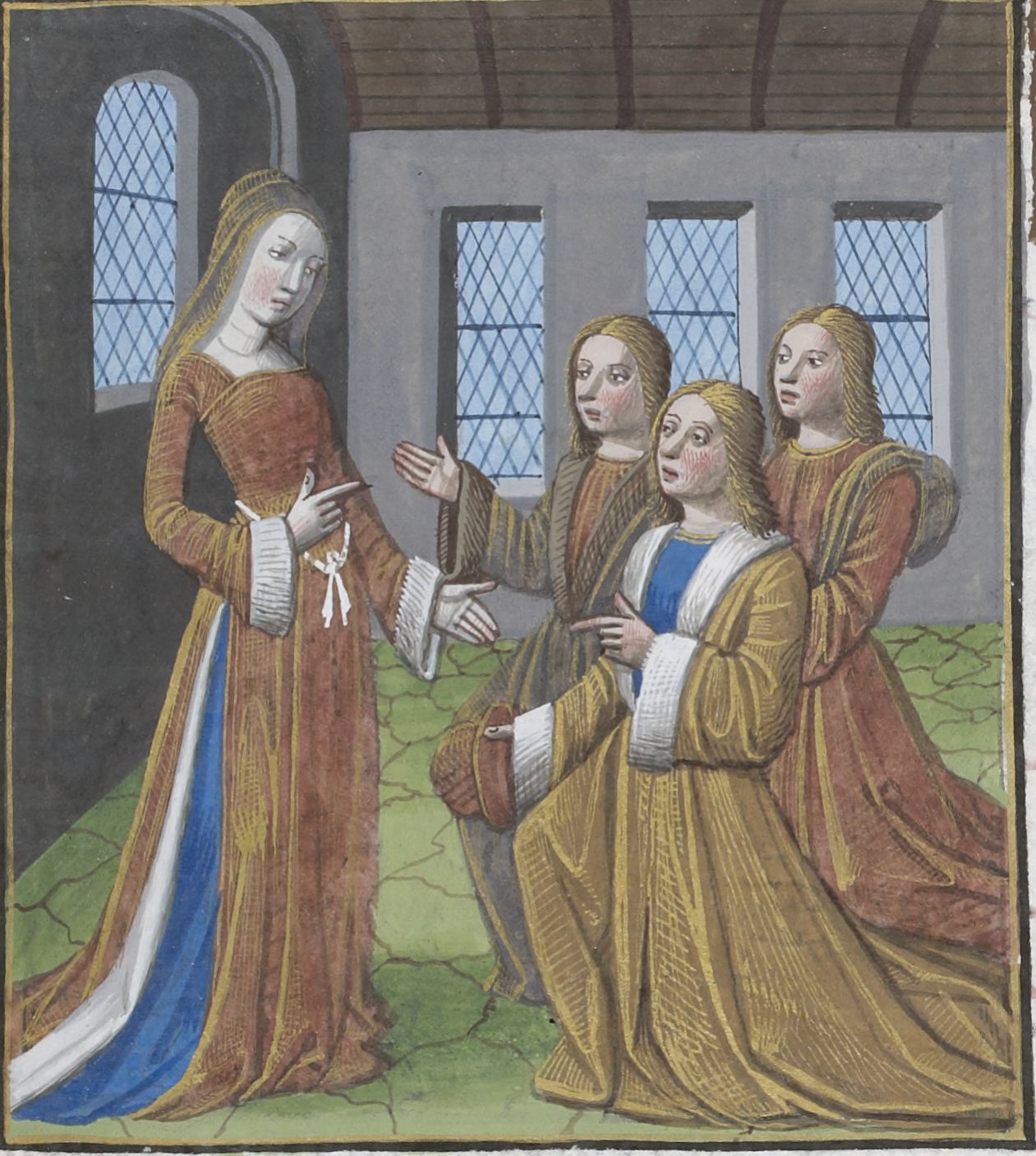 Parigi, Bibliothèque Nationale de France, Vélins 1223, f. c1r. Incunabolo miniato stampato a Parigi da Antoine Vérard il 26/04/1493. La dea Venere si rivolge ad un gruppo di ammiratori inginocchiati dinanzi a lei.