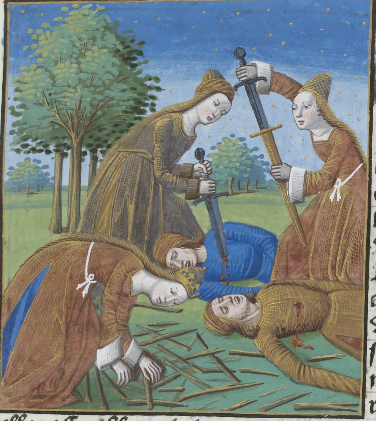 Parigi, Bibliothèque Nationale de France, Vélins 1223, f. d1r. Incunabolo miniato stampato a Parigi da Antoine Vérard il 26/04/1493. Mentre si compie il massacro degli uomini di Lemno, Isifile raccoglie la legna per il rogo dove fingerà di bruciare il padre.