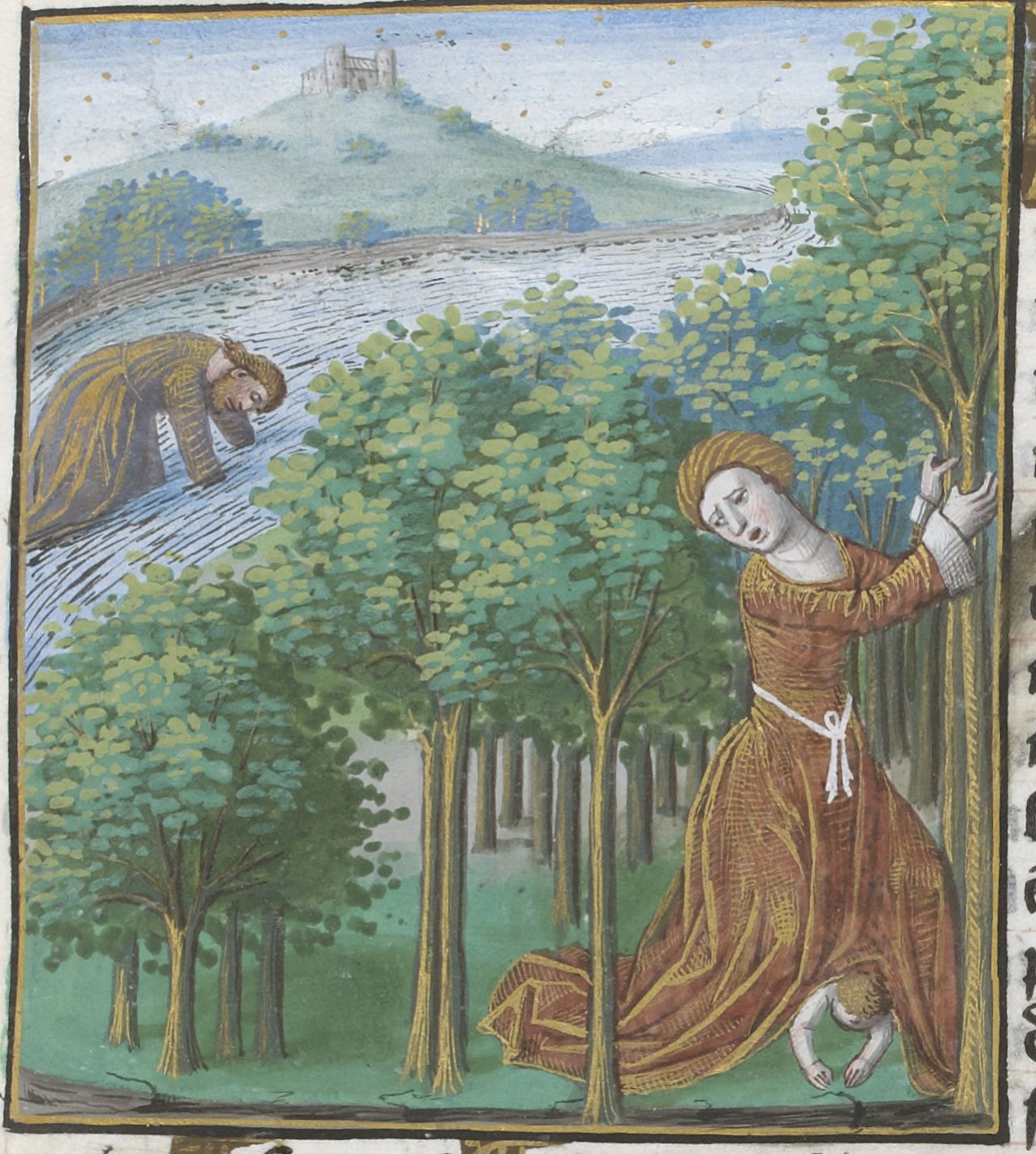 Parigi, Bibliothèque Nationale de France, Vélins 1223, f. g3r. Incunabolo miniato stampato a Parigi da Antoine Vérard il 26/04/1493. Lavinia dà alla luce il figlio di Enea nel bosco; Enea annega nel fiume.