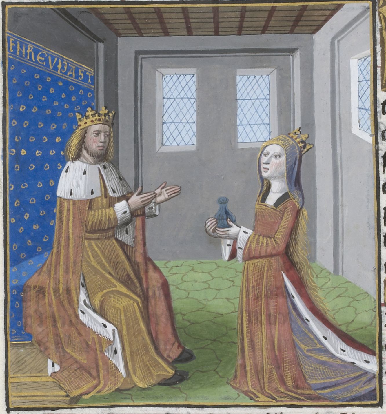 Parigi, Bibliothèque Nationale de France, Vélins 1223, f. h2v. Incunabolo miniato stampato a Parigi da Antoine Vérard il 26/04/1493. La regina Nicaula offre doni al re Salomone.