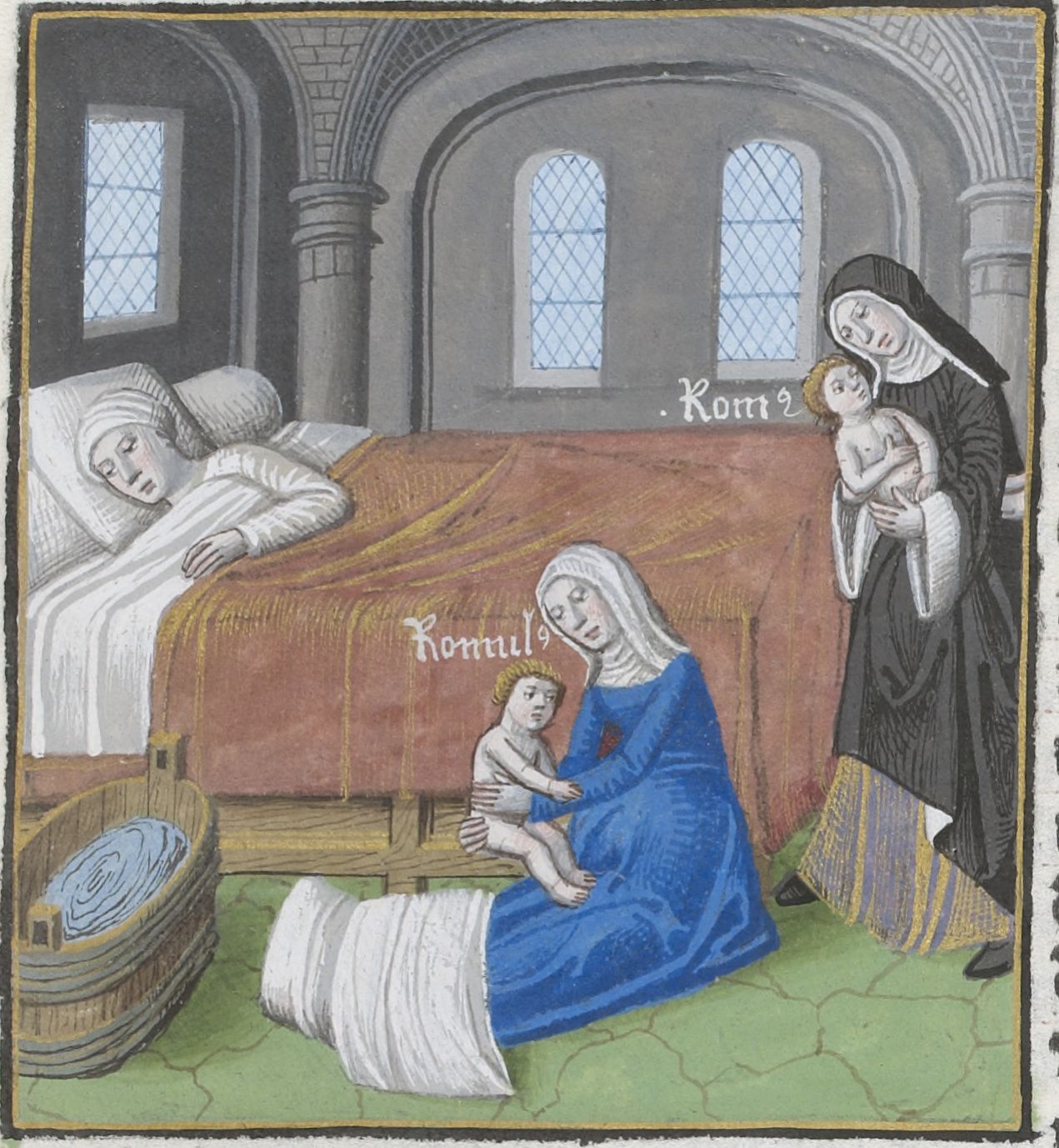 Parigi, Bibliothèque Nationale de France, Vélins 1223, f. h4r. Incunabolo miniato stampato a Parigi da Antoine Vérard il 26/04/1493. Rea Silvia dà alla luce i gemelli Romolo e Remo con l'aiuto di due fantesche.
