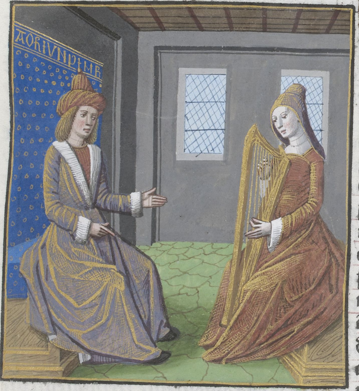 Parigi, Bibliothèque Nationale de France, Vélins 1223, f. h6r. Incunabolo miniato stampato a Parigi da Antoine Vérard il 26/04/1493. La poetessa Saffo suona l'arpa dinanzi ad un uomo (Apollo?).