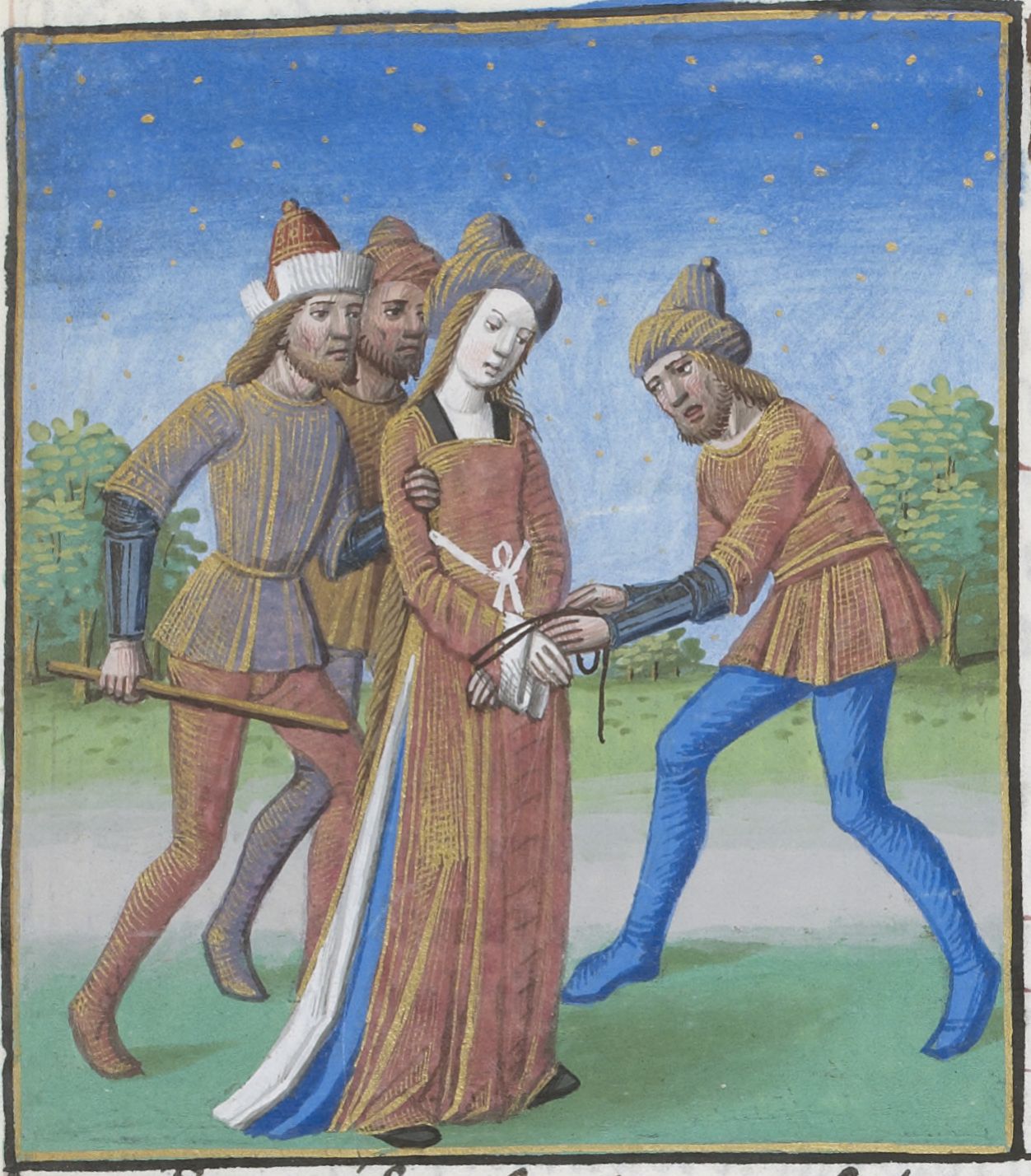 Parigi, Bibliothèque Nationale de France, Vélins 1223, f. l3r. Incunabolo miniato stampato a Parigi da Antoine Vérard il 26/04/1493. La regina Olimpiade viene fatta prigioniera.