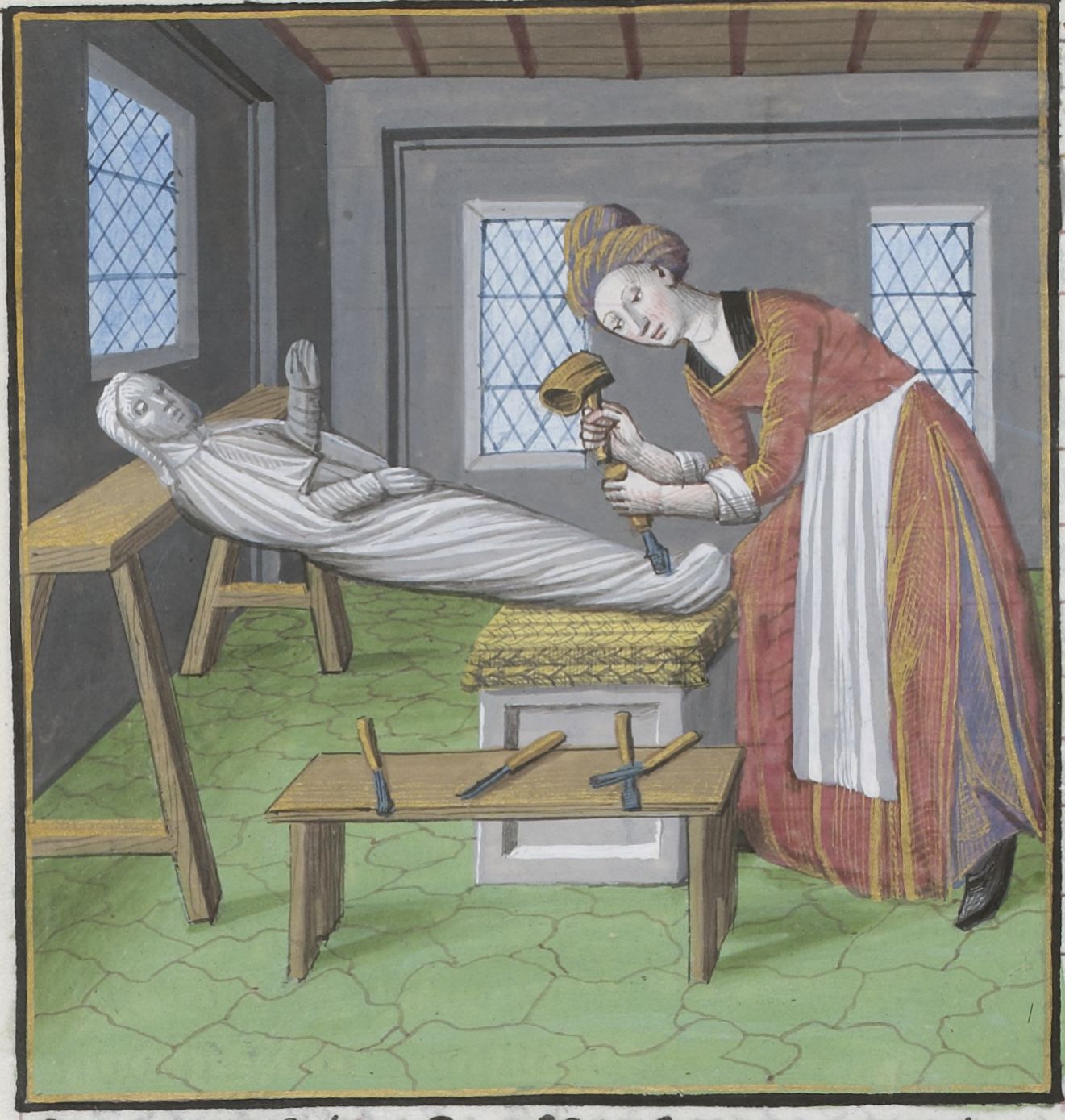 Parigi, Bibliothèque Nationale de France, Vélins 1223, f. l8v. Incunabolo miniato stampato a Parigi da Antoine Vérard il 26/04/1493. Marzia scolpisce una statua.