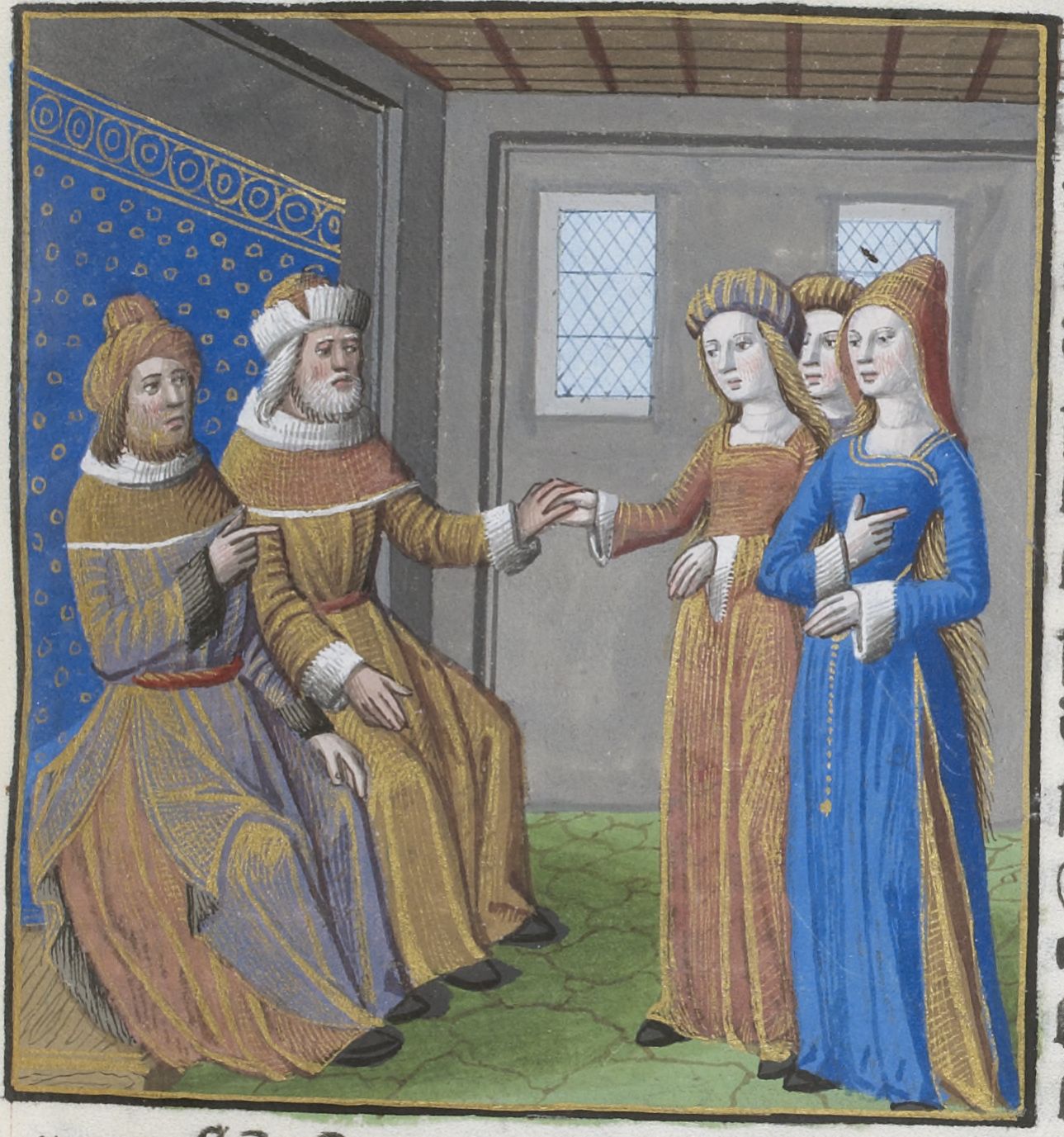 Parigi, Bibliothèque Nationale de France, Vélins 1223, f. m1r. Incunabolo miniato stampato a Parigi da Antoine Vérard il 26/04/1493. Sulpicia viene presentata in senato dalle donne romane.