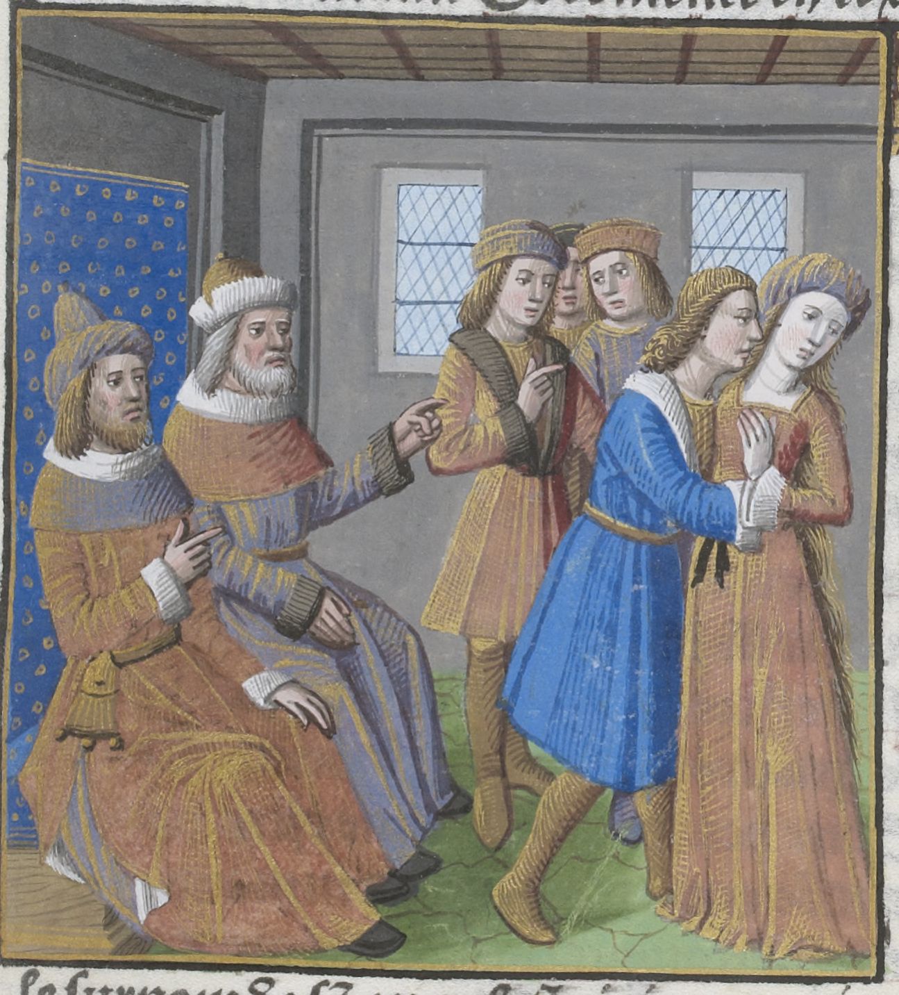 Parigi, Bibliothèque Nationale de France, Vélins 1223, f. n2r. Incunabolo miniato stampato a Parigi da Antoine Vérard il 26/04/1493. Sempronia rifiuta di riconoscere il nipote dinanzi al senato.