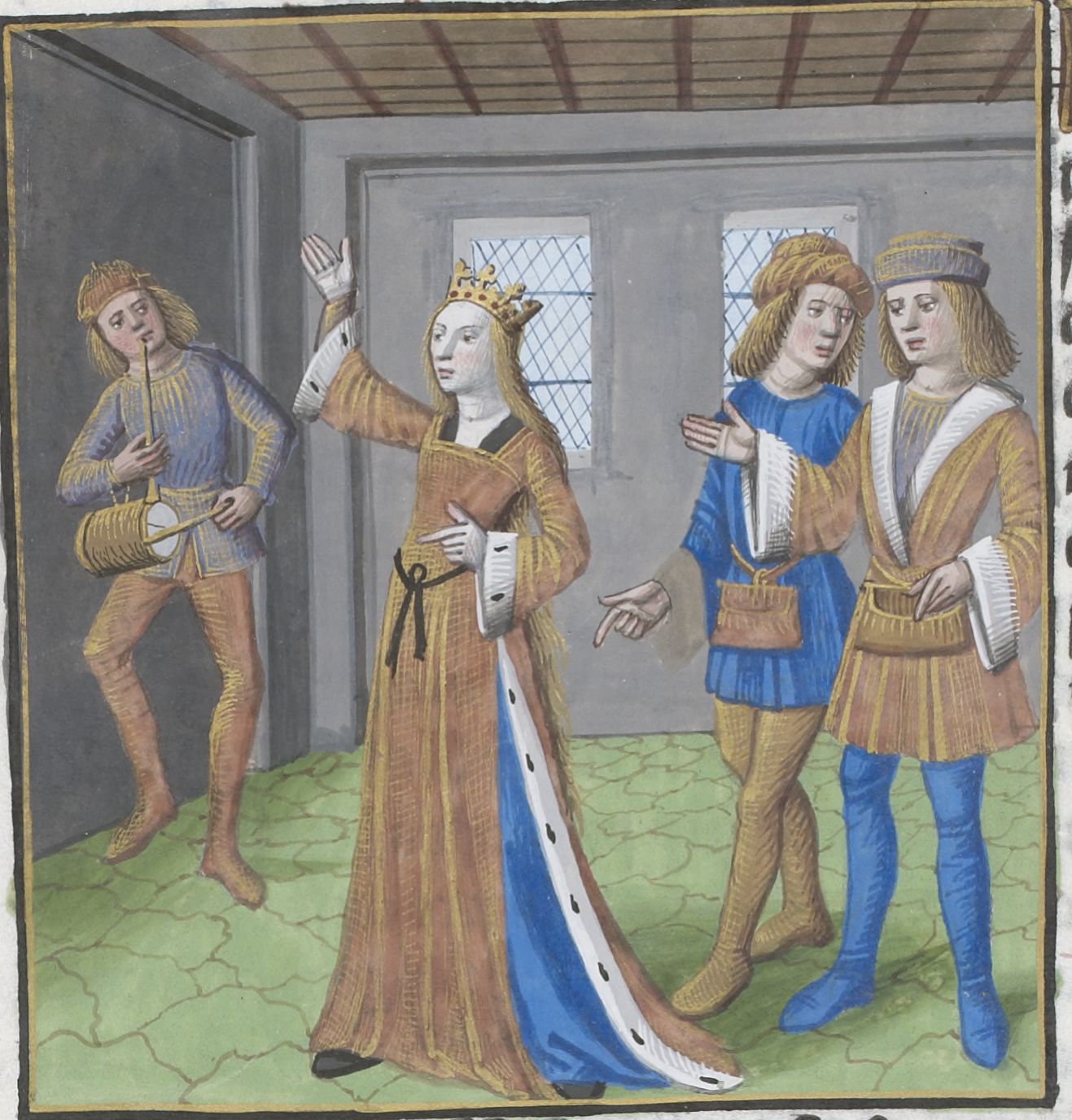 Parigi, Bibliothèque Nationale de France, Vélins 1223, f. n5v. Incunabolo miniato stampato a Parigi da Antoine Vérard il 26/04/1493. Sempronia danza al suono del tamburo e del flauto osservata da due giovani.