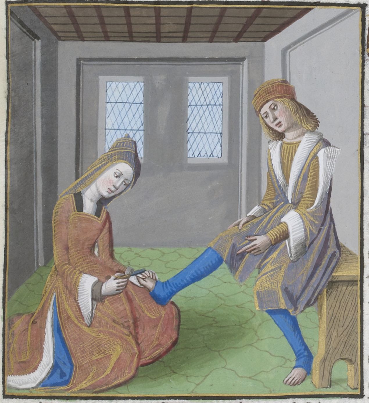 Parigi, Bibliothèque Nationale de France, Vélins 1223, f. n8r. Incunabolo miniato stampato a Parigi da Antoine Vérard il 26/04/1493. Porzia lima le unghie di un uomo (testo mal compreso).