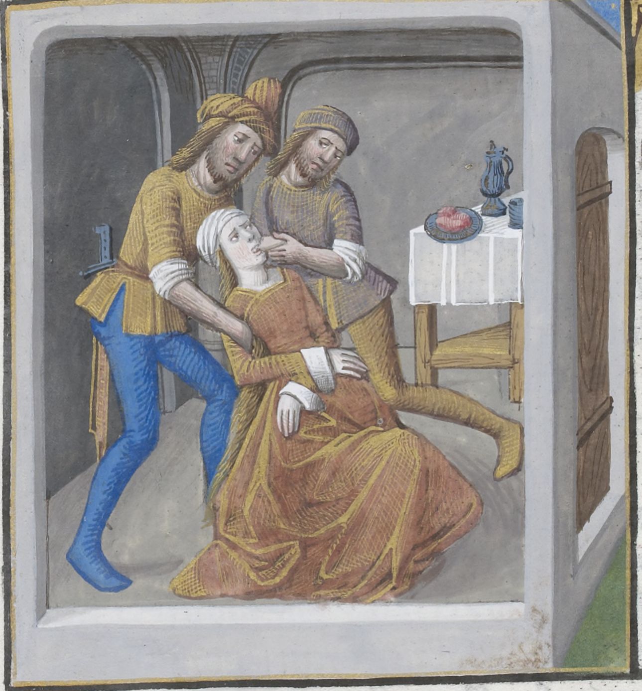 Parigi, Bibliothèque Nationale de France, Vélins 1223, f. p3v. Incunabolo miniato stampato a Parigi da Antoine Vérard il 26/04/1493. Agrippina, moglie di Germanico, viene nutrita a forza in prigione.