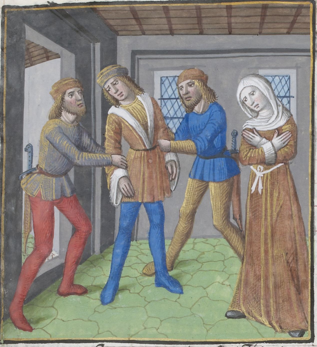 Parigi, Bibliothèque Nationale de France, Vélins 1223, f. q4r. Incunabolo miniato stampato a Parigi da Antoine Vérard il 26/04/1493. Pompea Paolina si duole per il marito Seneca, il quale viene condotto via da due servi che lo assisteranno nel suicidio.