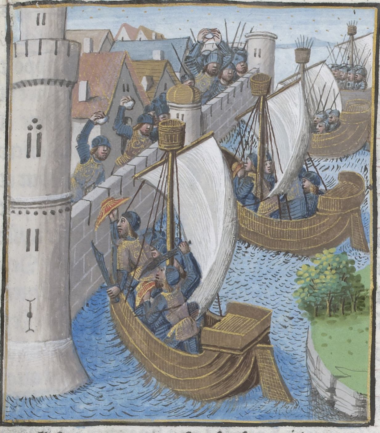 Parigi, Bibliothèque Nationale de France, Vélins 1223, f. q7r. Incunabolo miniato stampato a Parigi da Antoine Vérard il 26/04/1493. Le navi di Lucio Vitellio, marito di Triaria, assediano una città dei Volsci.