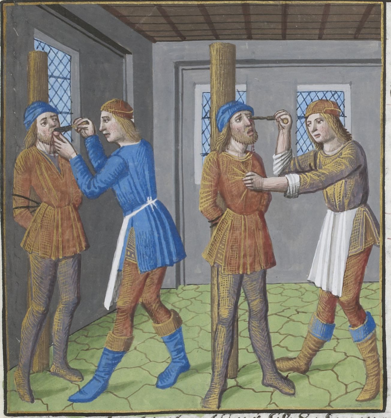 Parigi, Bibliothèque Nationale de France, Vélins 1223, f. s1r. Incunabolo miniato stampato a Parigi da Antoine Vérard il 26/04/1493. Per ordine di Costantino viene asportata la lingua a Niceforo e vengono cavati gli occhi ad un altro personaggio.