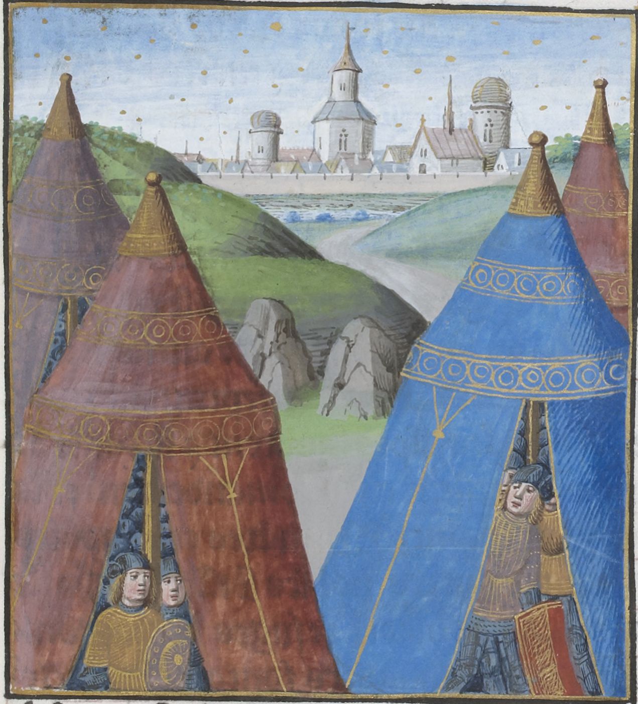 Parigi, Bibliothèque Nationale de France, Vélins 1223, f. t3r. Incunabolo miniato stampato a Parigi da Antoine Vérard il 26/04/1493. L'accampamento della regina Giovanna I.