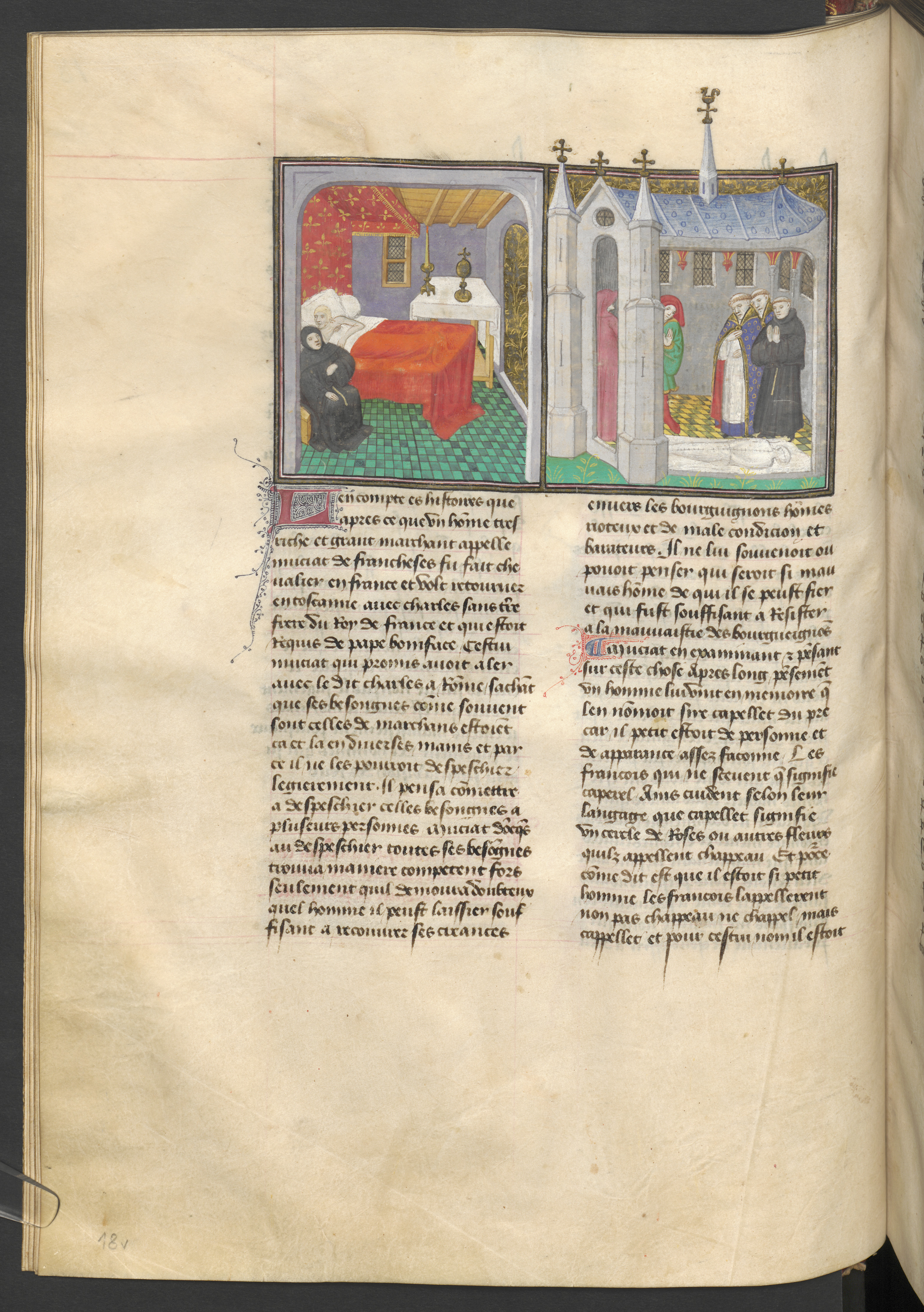 Miniatore francese (1425-1450), La confessione di Ser Ciappelletto morente; i fedeli vengono invitati alla devozione