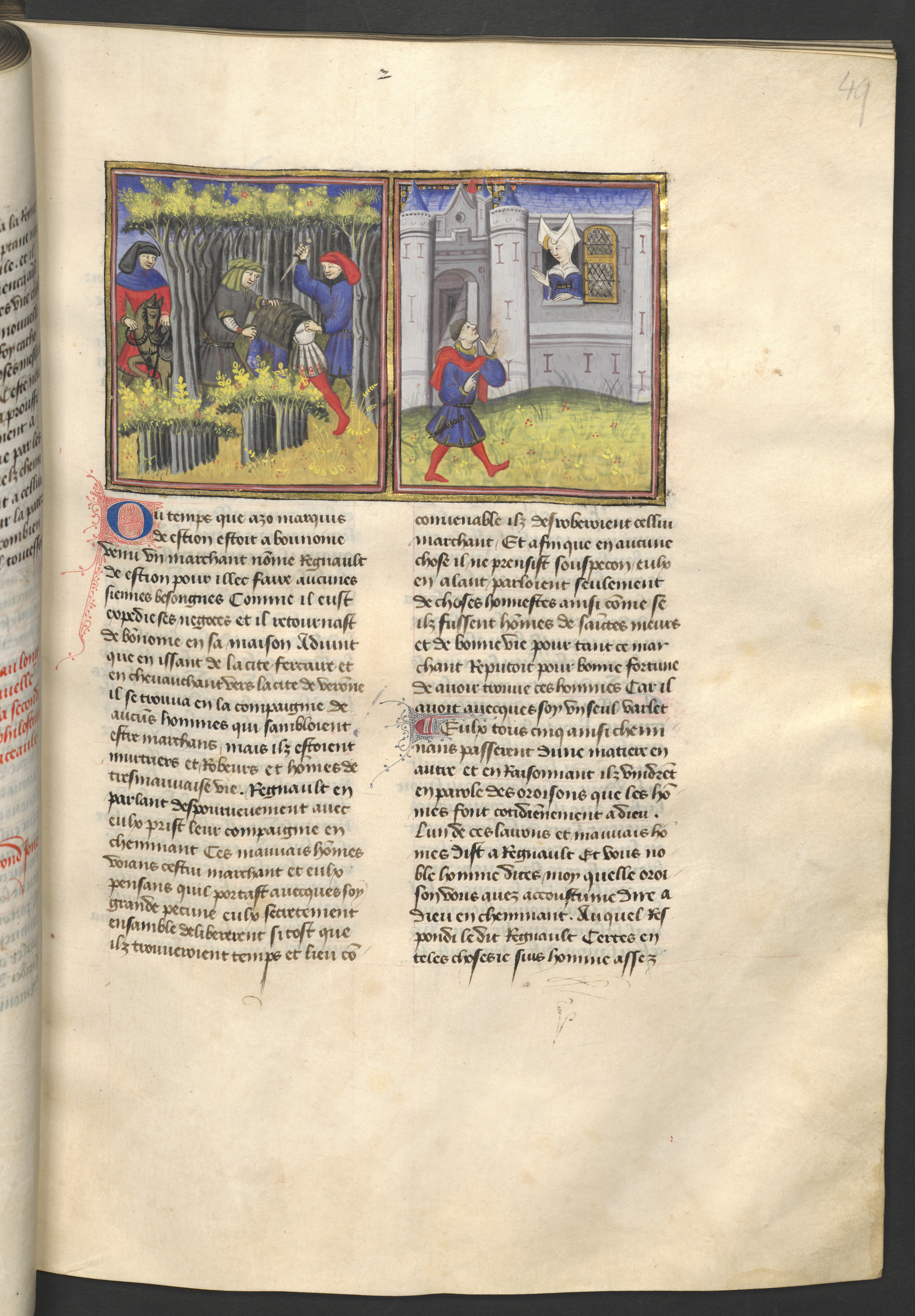 Vienna, Österreichische Nationalbibliothek, 2561, f. 49r. Il mercante Rinaldo d'Asti viene derubato e spogliato da tre banditi sulla strada per Verona; Rinaldo, dopo aver ricevuto nuovi vestiti, si congeda dalla vedova che lo ha soccorso.