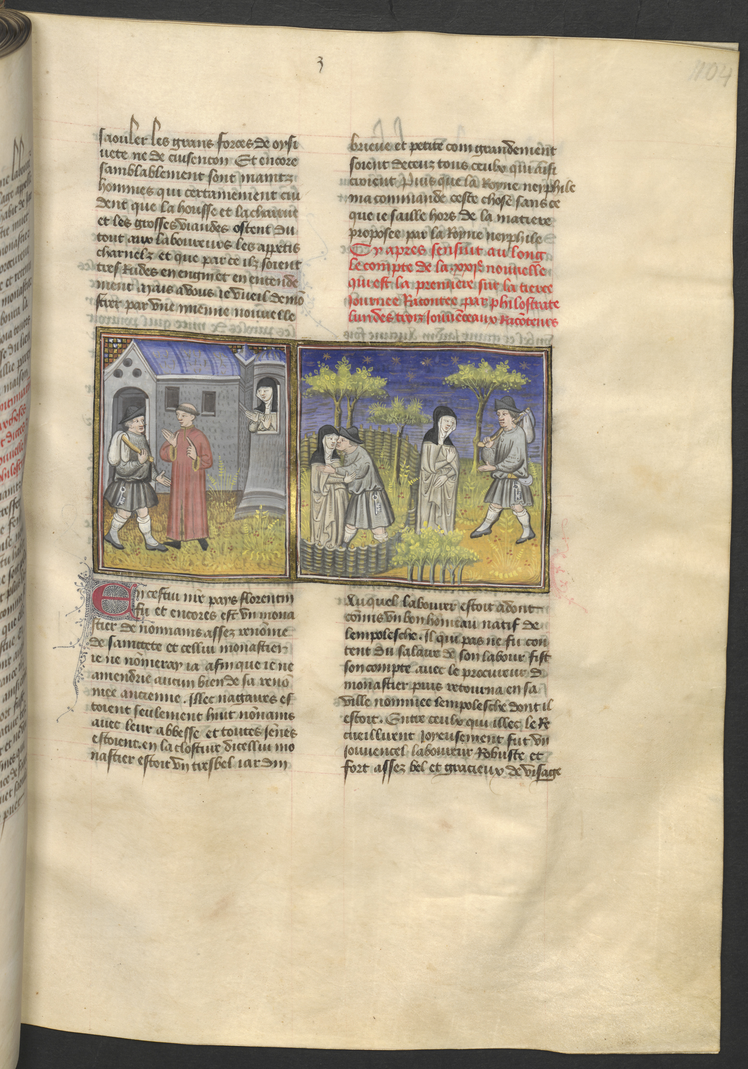 Vienna, Österreichische Nationalbibliothek, 2561, f. 104r. Fingendosi sordomuto, Masetto chiede al castaldo di poter entrare nel convento delle monache; Masetto e una monaca si baciano di nascosto nel giardino.