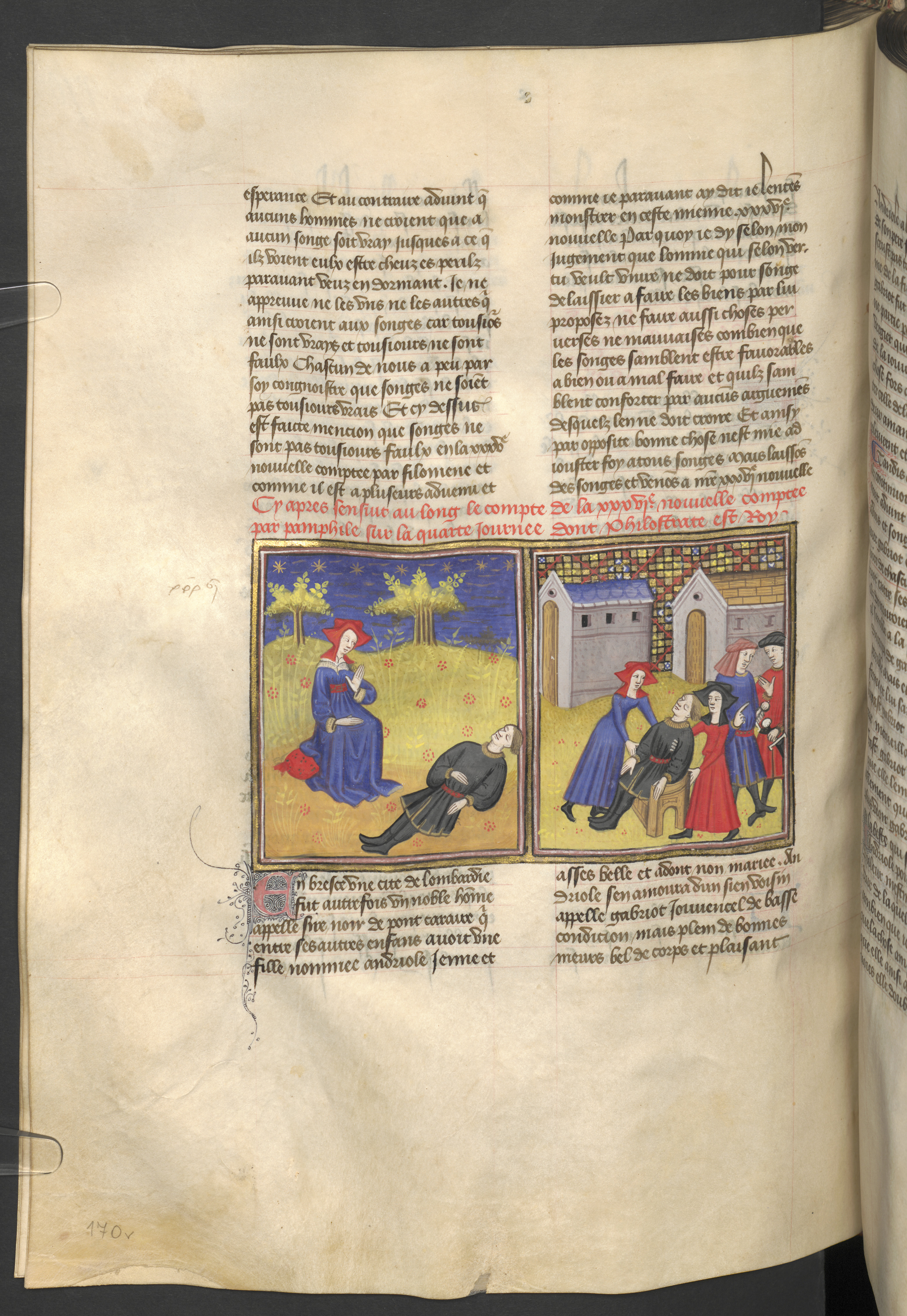 Miniatore francese (1425-1450), Andreuola piange la morte di Gabriotto; Andreuola trasporta il corpo dell'amato