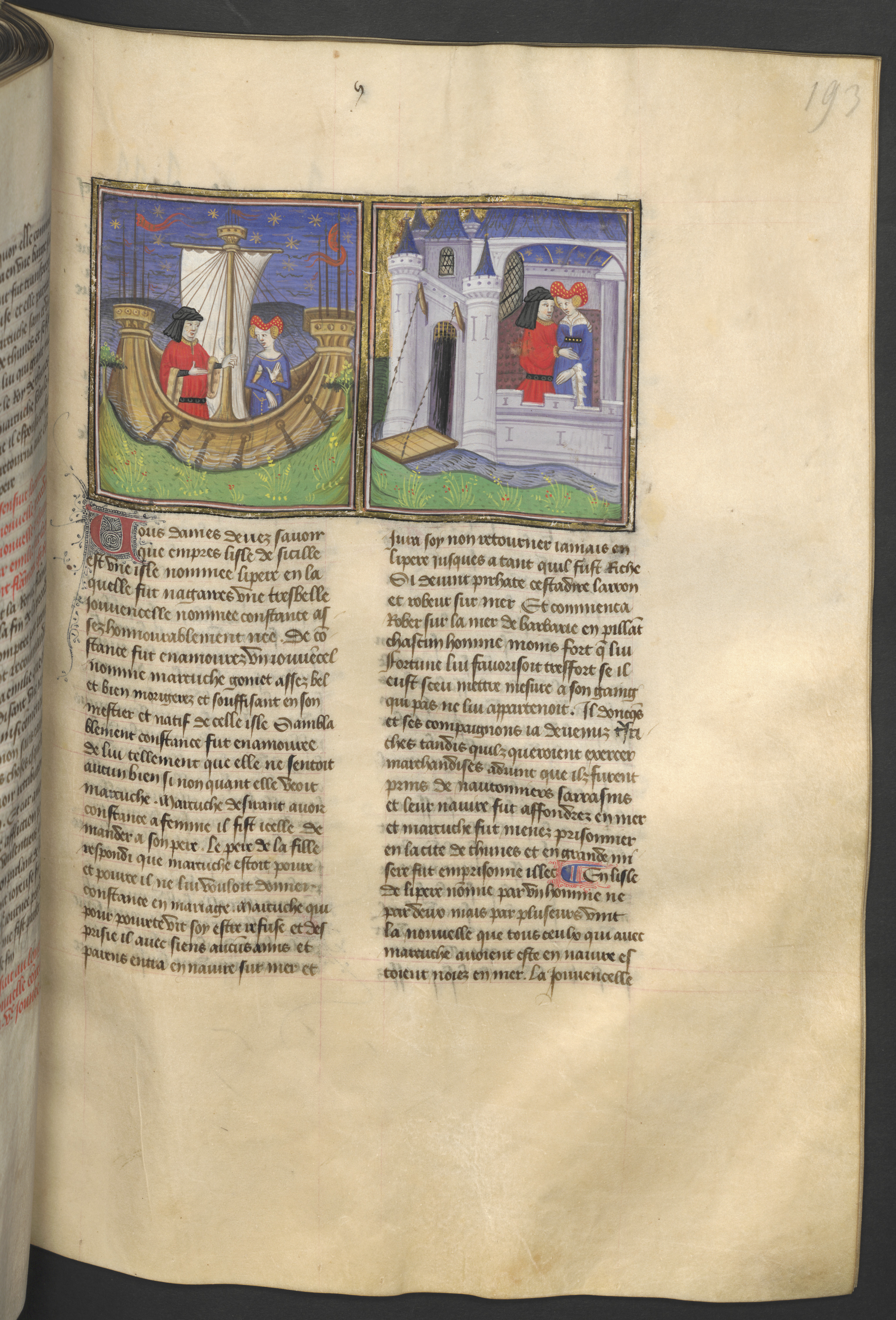 Vienna, Österreichische Nationalbibliothek, 2561, f. 193r. Gostanza e Martuccio insieme su una nave; Gostanza si ricongiunge con l'amato Martuccio nel castello di Tunisi.