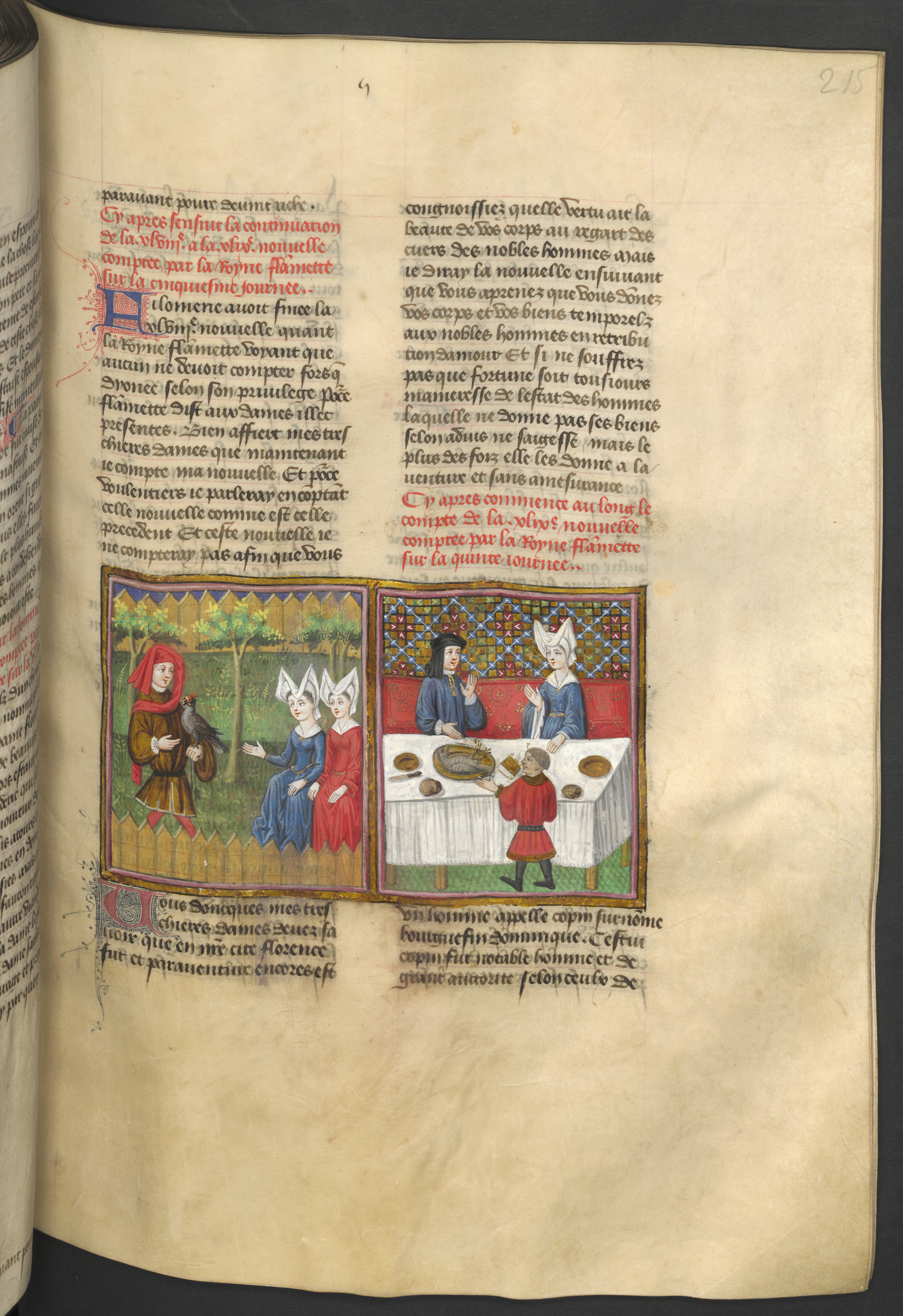 Vienna, Österreichische Nationalbibliothek, 2561, f. 215r. Federigo degli Alberighi mostra a monna Giovanna e un'altra donna il proprio falcone; Federigo serve il falcone come pietanza a Giovanna.