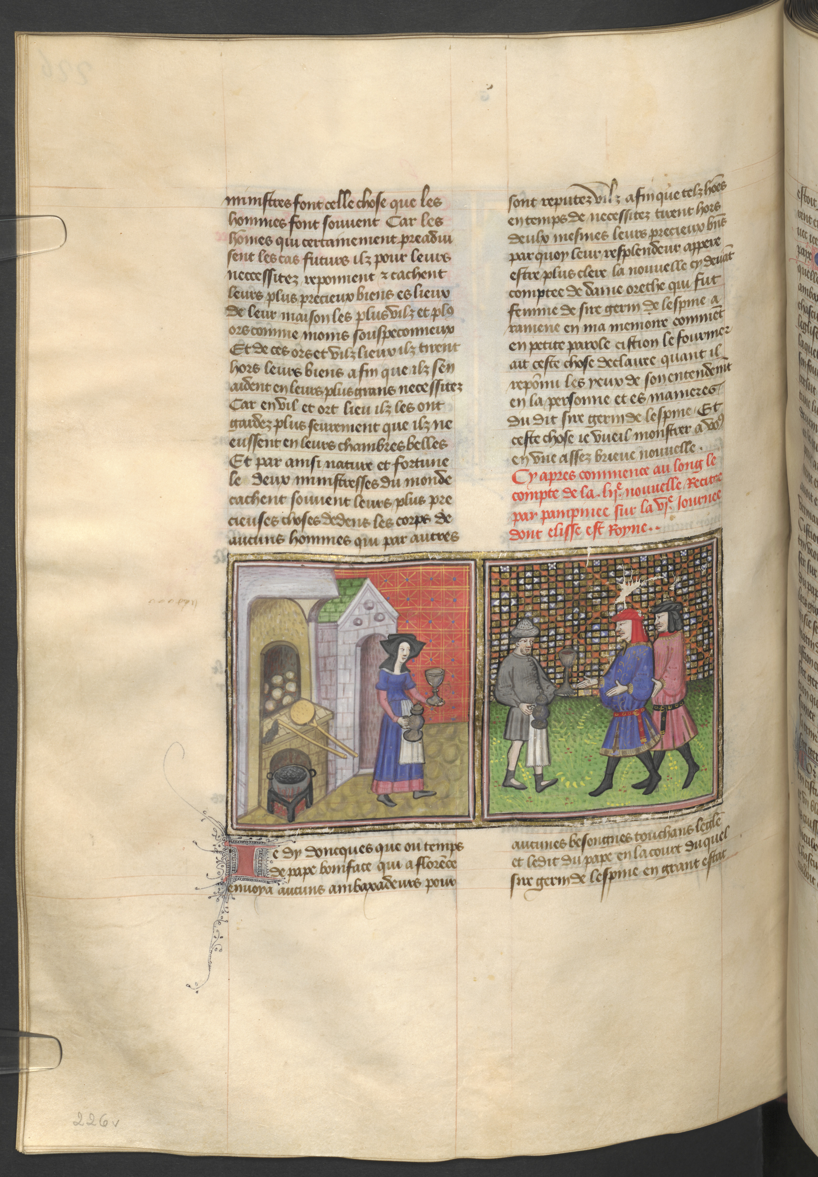 Vienna, Österreichische Nationalbibliothek, 2561, f. 226v. Una donna reca del vino e una coppa dalla bottega del fornaio Cisti; Cisti offre il suo vino a messer Geri Spina e all'ambasciatore del Papa.