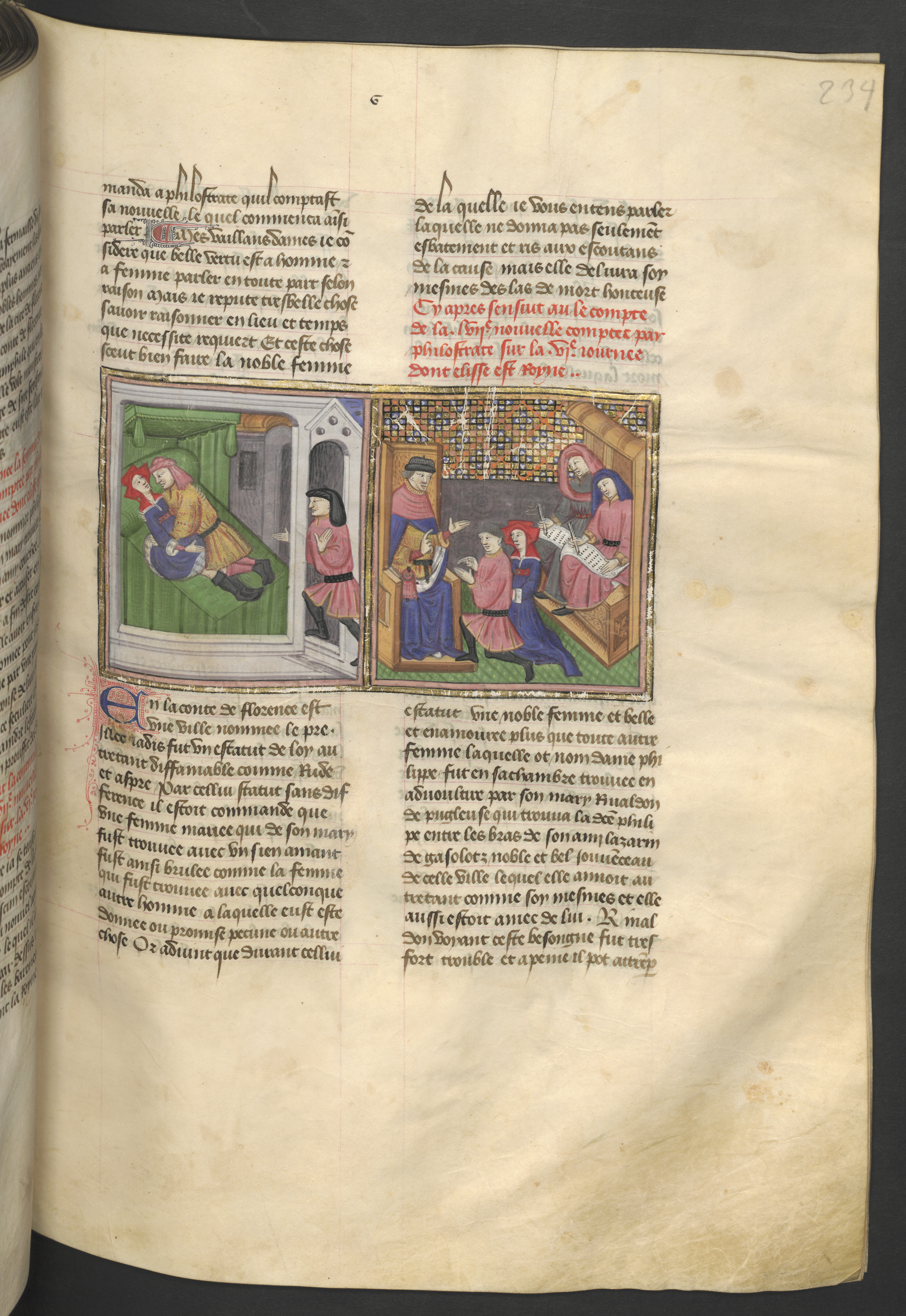 Vienna, Österreichische Nationalbibliothek, 2561, f. 234r. Filippa viene scoperta dal marito durante l'adulterio; la donna si difende dinanzi al giudice e fa cambiare lo statuto della città di Prato.