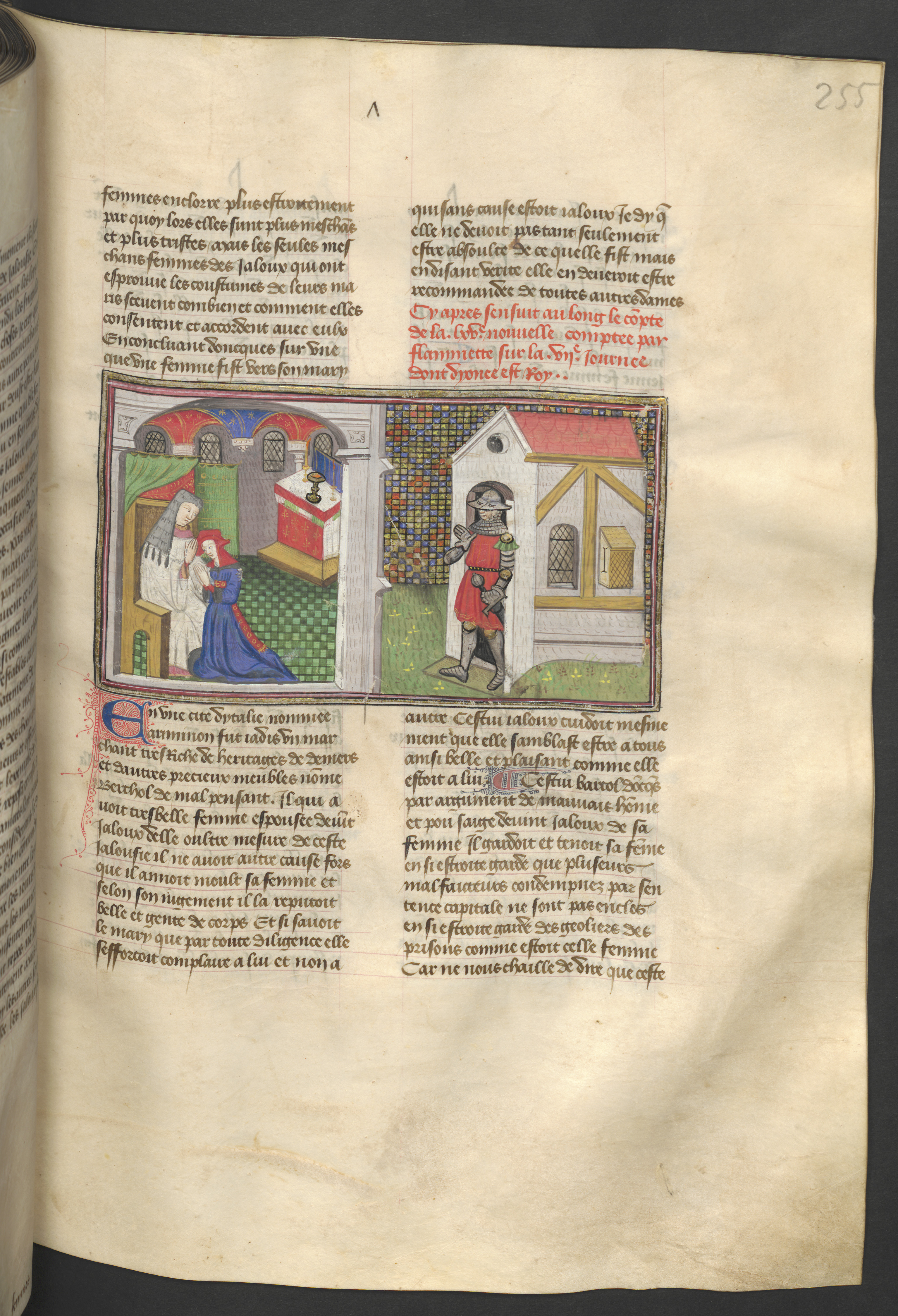 Vienna, Österreichische Nationalbibliothek, 2561, f. 255r. Arimino, travestito da prete, ascolta la confessione della moglie; di notte l'uomo monta la guardia davanti alla porta di casa.