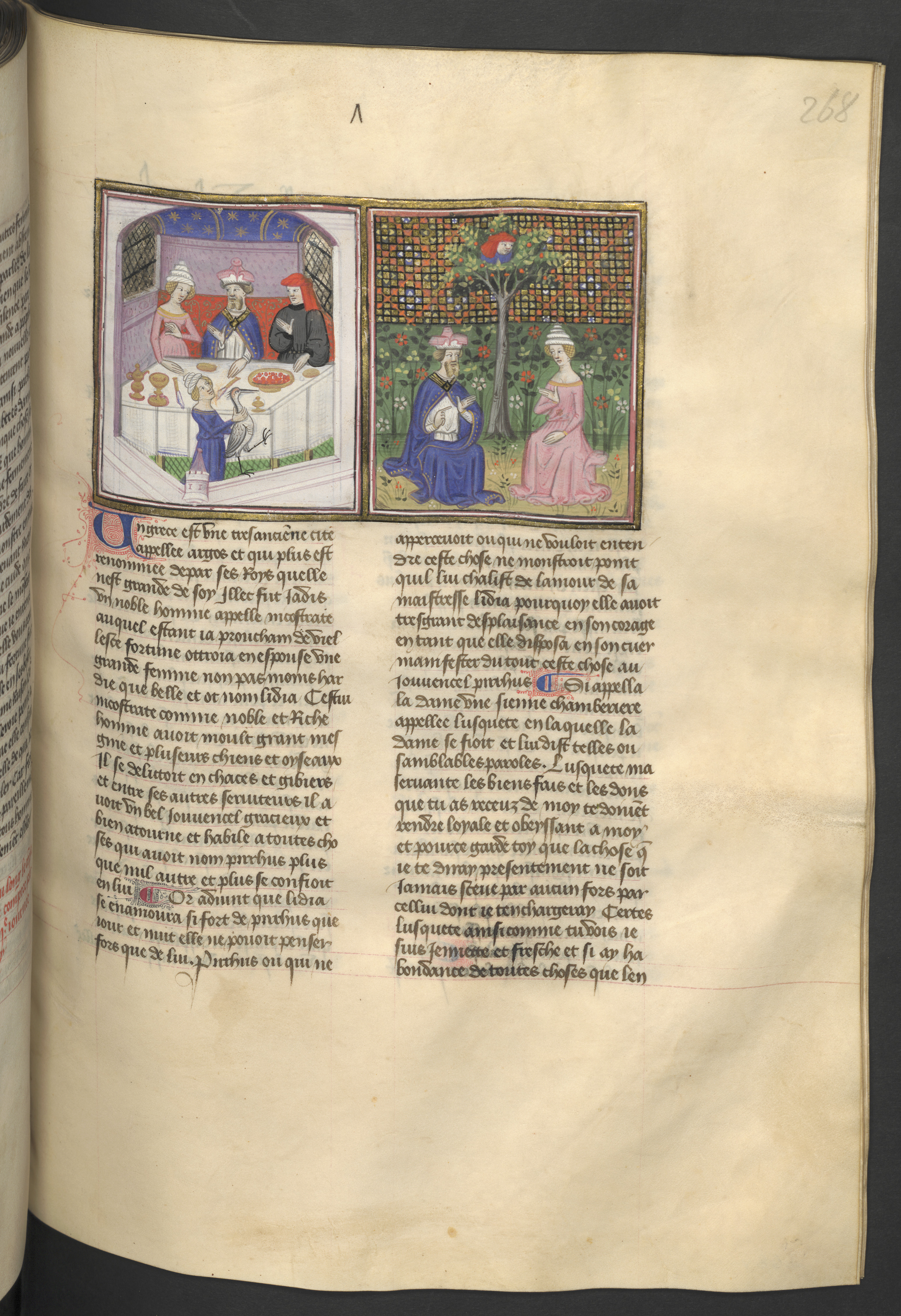Vienna, Österreichische Nationalbibliothek, 2561, f. 268r. Lidia uccide lo sparviero di suo marito Nicostrato durante un banchetto; Lidia e Nicostrato conversano distesi in un prato, mentre Pirro è nascosto tra i rami di un pero.
