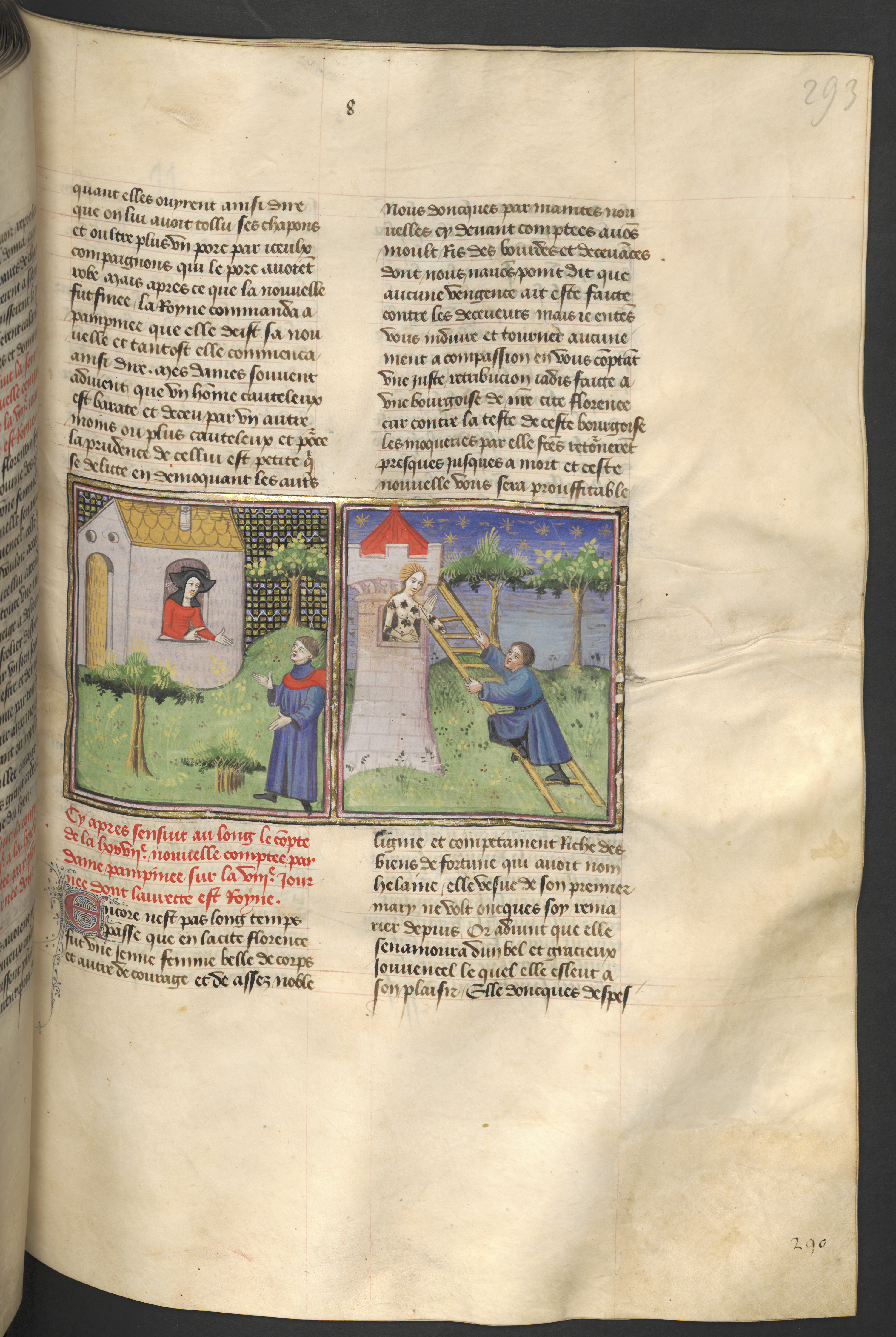 Miniatore francese (1425-1450), La vedova Elena chiude Rinieri fuori casa; l'uomo lascia la donna nuda in cima ad una torre