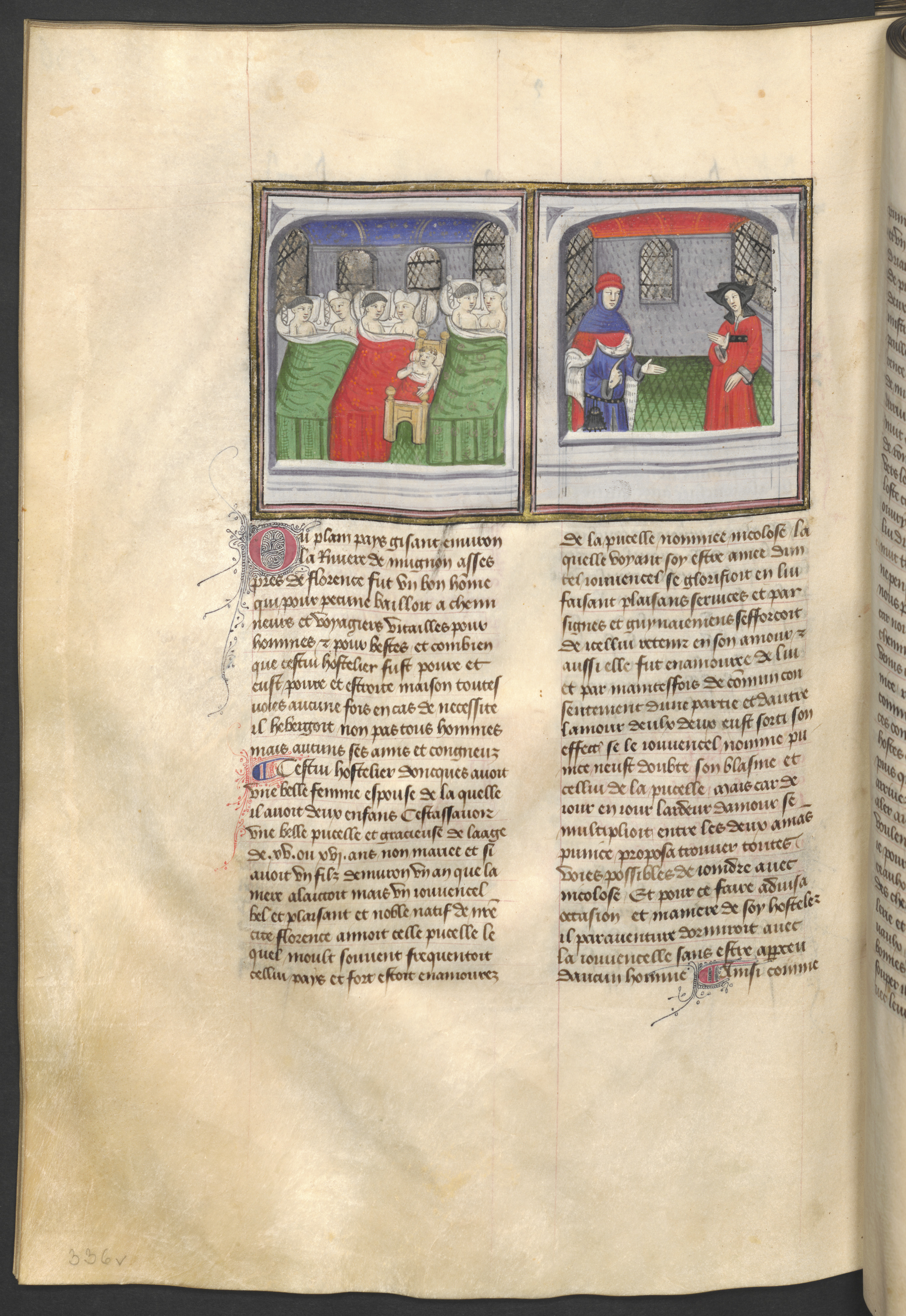 Vienna, Österreichische Nationalbibliothek, 2561, f. 336v. Un oste e la sua famiglia ospitano due giovani a dormire; la donna placa il marito chiarendo l'equivoco.