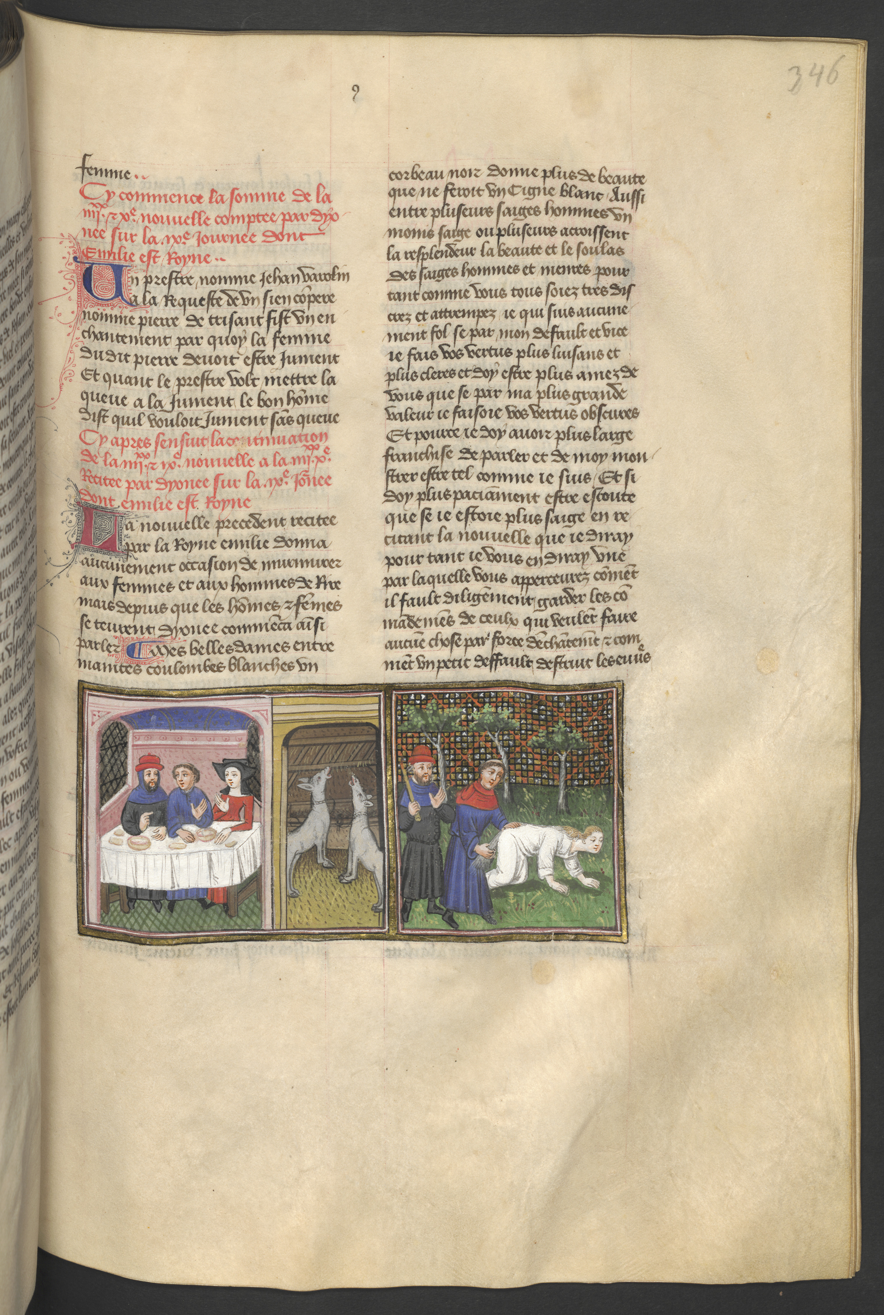 Vienna, Österreichische Nationalbibliothek, 2561, f. 346r. Donno Gianni di Barolo siede a tavola con Pietro da Tresanti e sua moglie, nella stalla accanto si trovano due cavalli; Pietro interrompe donno Gianni mentre questi tenta di attaccare la coda di cavallo alla donna.