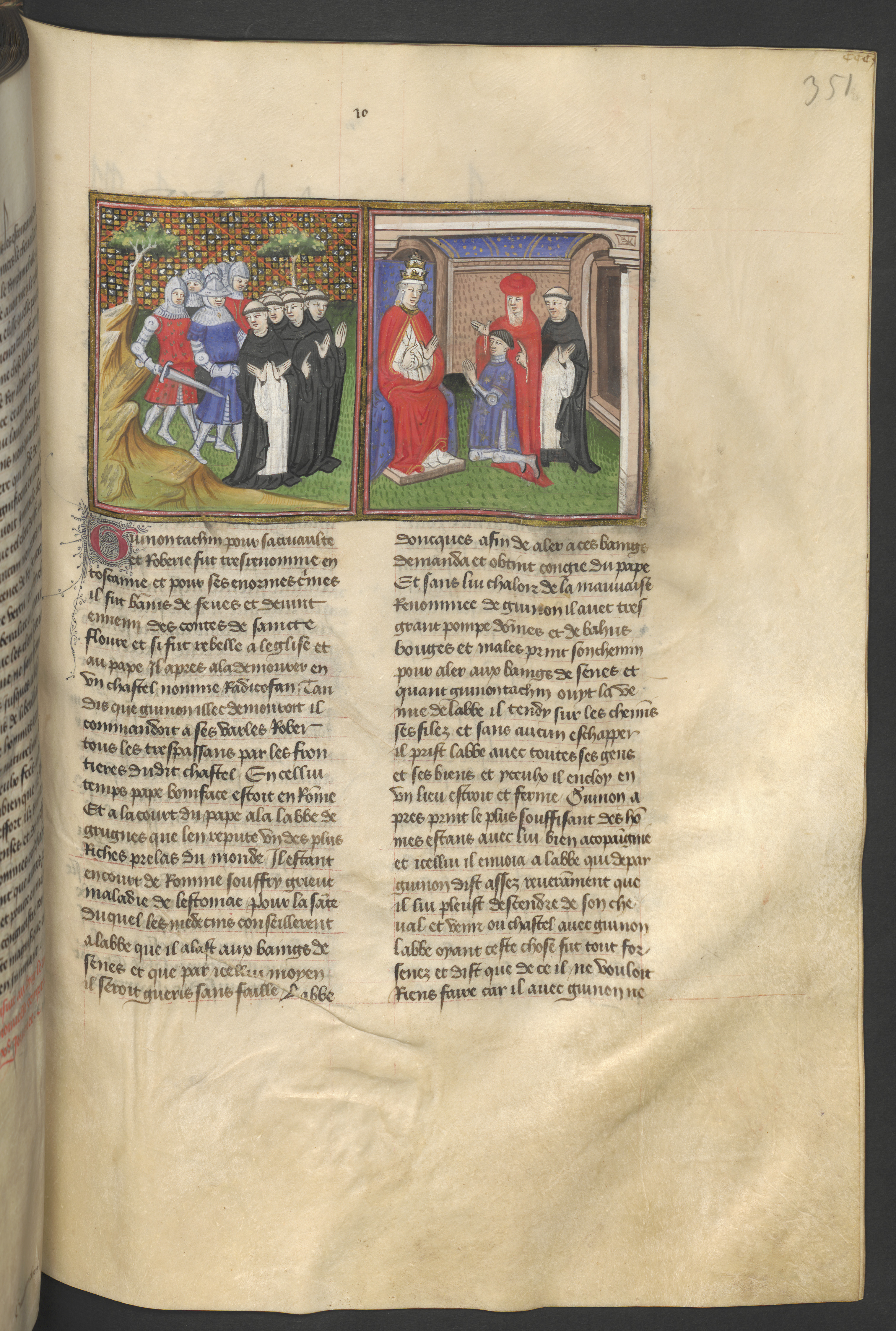 Vienna, Österreichische Nationalbibliothek, 2561, f. 351r. Ghino di Tacco cattura l'abate di Clignì sulla strada per Siena; l'abate intercede per Ghino presso il Papa.