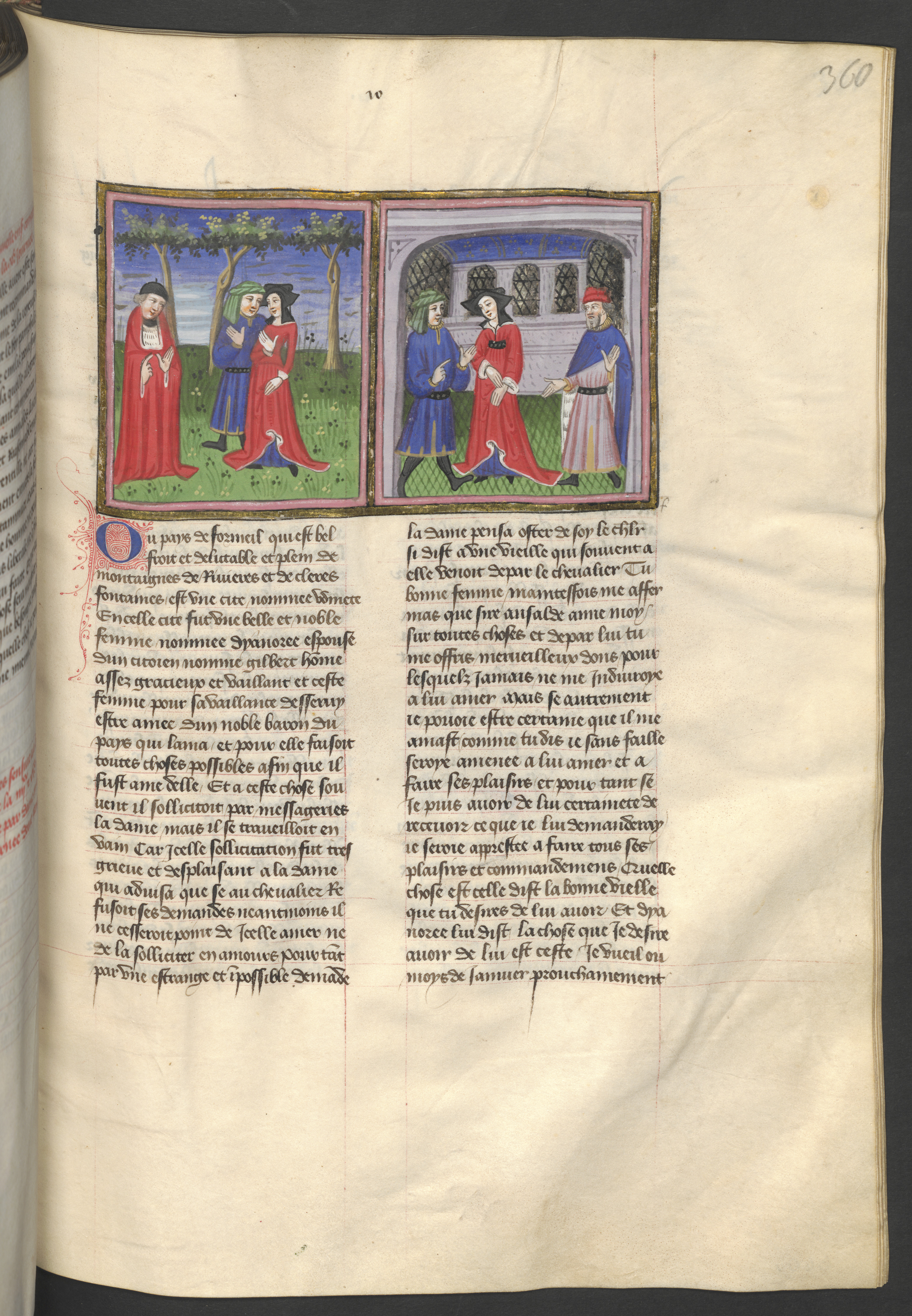 Vienna, Österreichische Nationalbibliothek, 2561, f. 360r. Ansaldo chiede ad un negromante di far fiorire il giardino d'inverno per conquistare Dianora; Ansaldo rinuncia alla donna per permetterle di ritornare dal marito Gilberto.