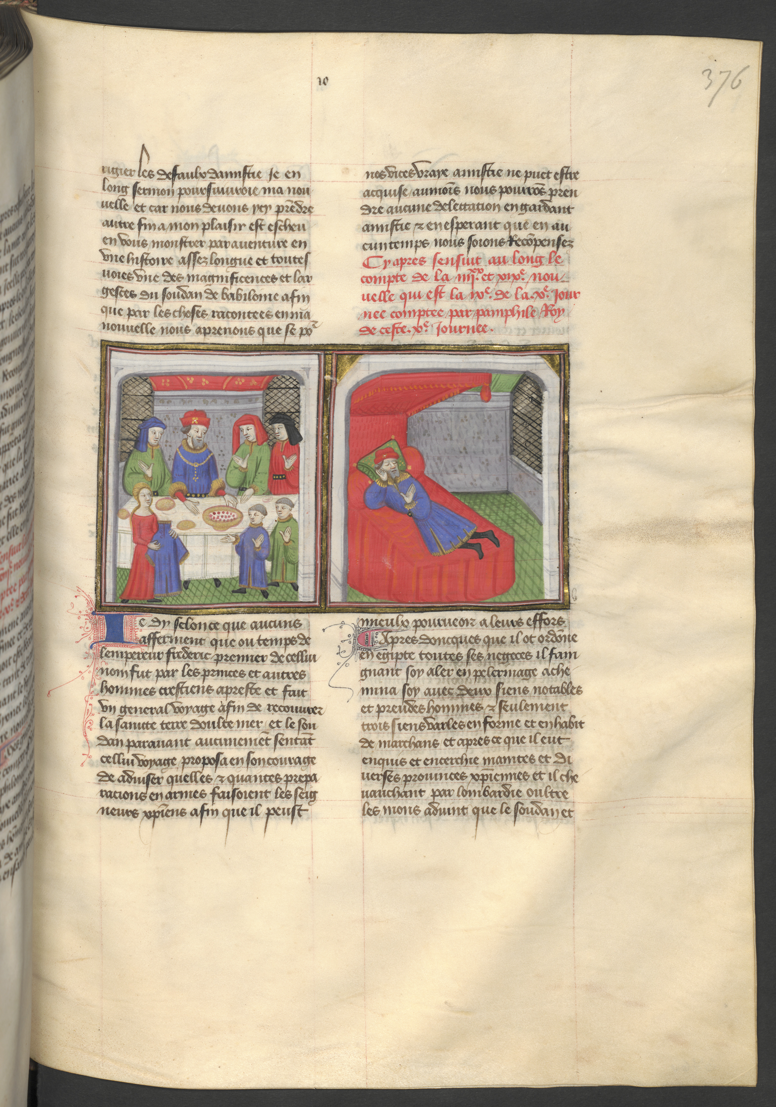 Vienna, Österreichische Nationalbibliothek, 2561, f. 376r. La moglie di messer Torello offre ricche vesti in dono al Saladino e ai suoi compagni; messer Torello giace addormentato sul letto.