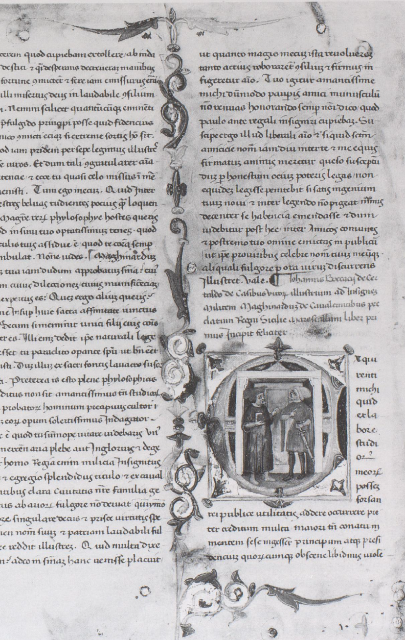 Copenaghen, Det Kongelige Bibliotek, GKS 472 2°, f. 1v. Il secondo copista del manoscritto è Beltramo di Leonardo Mignanelli da Siena. In un interno l'autore Giovanni Boccaccio con un libro tra le mani discute con Mainardo de' Cavalcanti, raffigurato con una spada al fianco, all'interno dell'iniziale istoriata E(xquirenti).