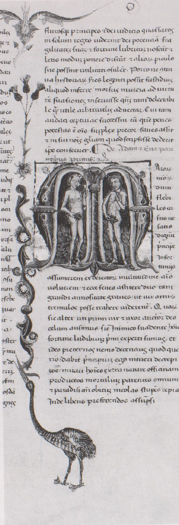 Copenaghen, Det Kongelige Bibliotek, GKS 472 2°, f. 2r. Il secondo copista del manoscritto è Beltramo di Leonardo Mignanelli da Siena. Adamo ed Eva si coprono con una foglia di fico, all'interno dell'iniziale figurata M(aiorum).