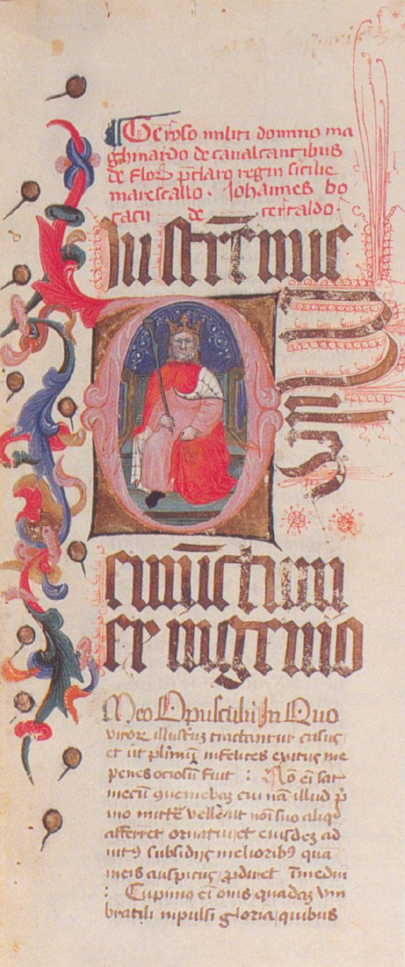 Modena, Biblioteca Estense Universitaria, α.O.5.21 (Lat. 235), f. 1r. Un sovrano in trono con la corona e lo scettro (Mainardo de' Cavalcanti?), all'interno dell'iniziale figurata D(iu).
