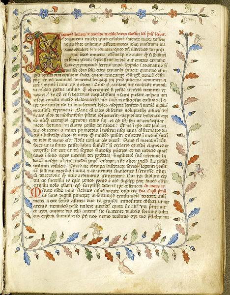 New York, Pierpont Morgan Library, M 943, f. 3r. Un uccello dal collo lungo, all'interno dell'iniziale figurata E(xquirenti); nel fregio decorativo a margine sono rafigurati un putto armato di lancia e scudo, una scimmia, un uccello, un cane e un gufo.
